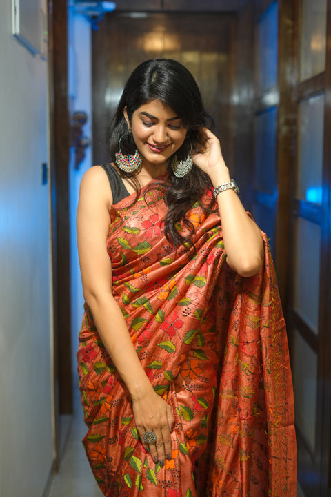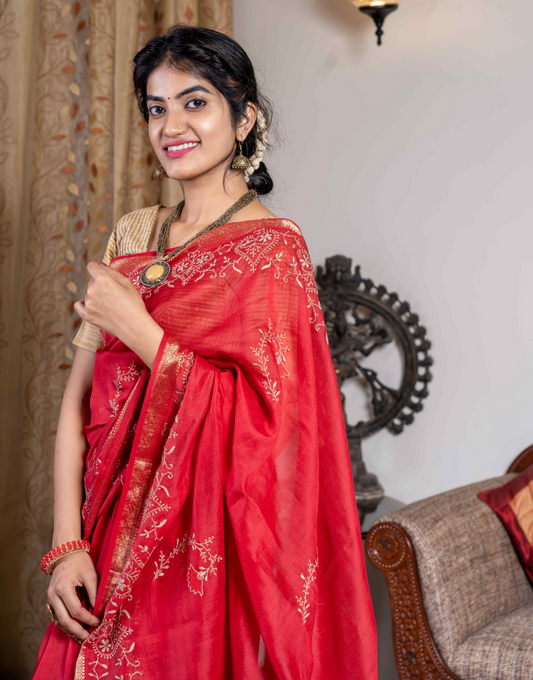 Sold outBrick Red Tussar Saree