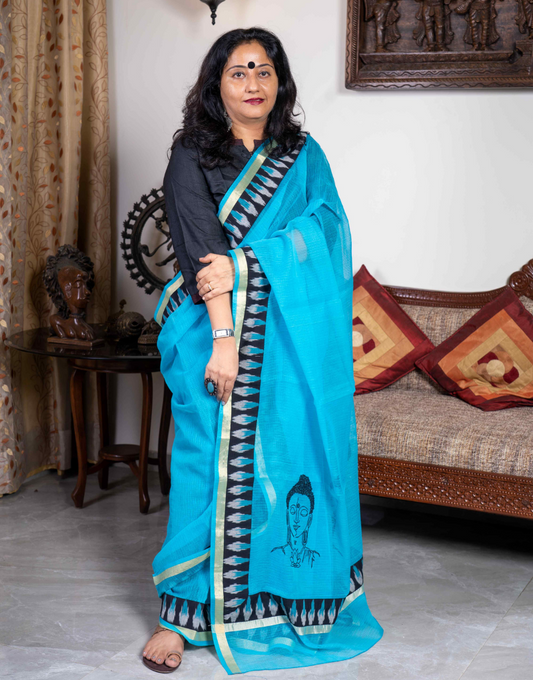 Blue Cotton Saree in Buddha Embroidery