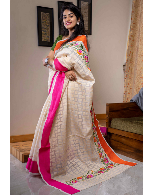 White Embroidered Bapta Silk Saree