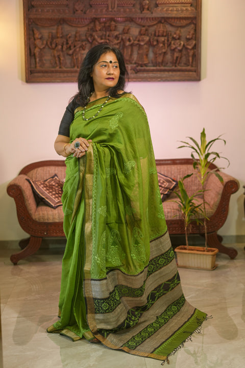 Pista Green Supernet Tussar Cotton Saree