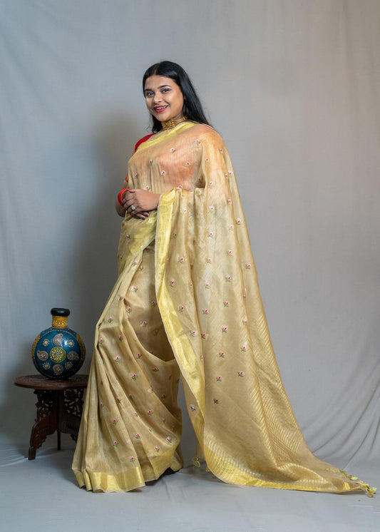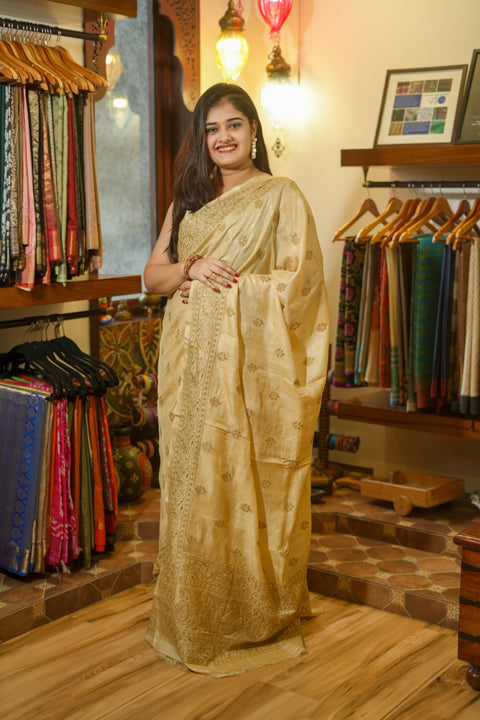 Beige Mirror Work Tussar Saree