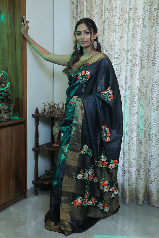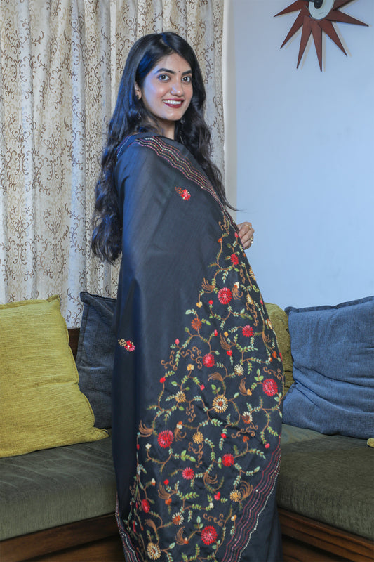Black Gachi Tussar Saree with Ari and Parsi Embroidery