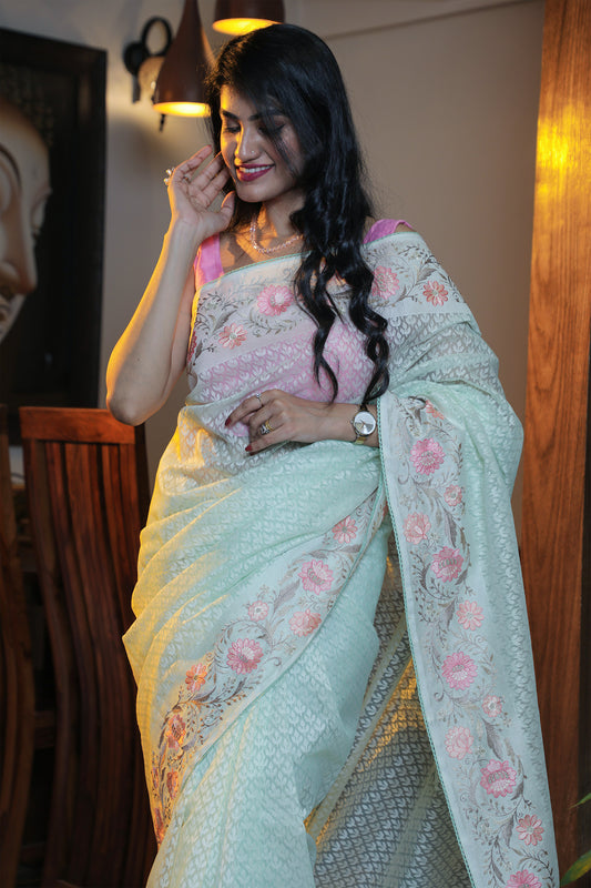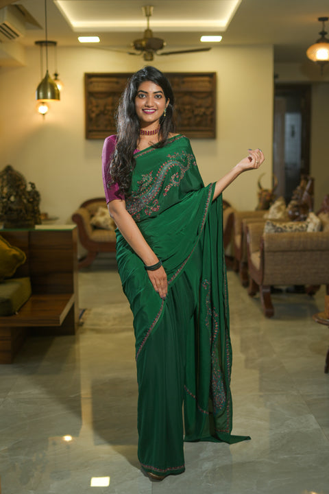 Emerald Green Crepe Saree with Kashmiri Work