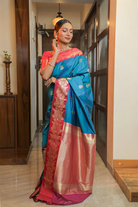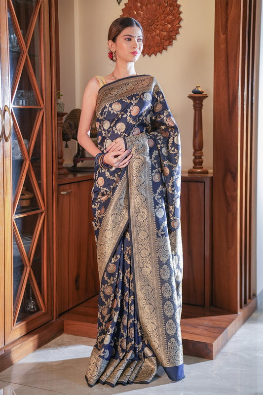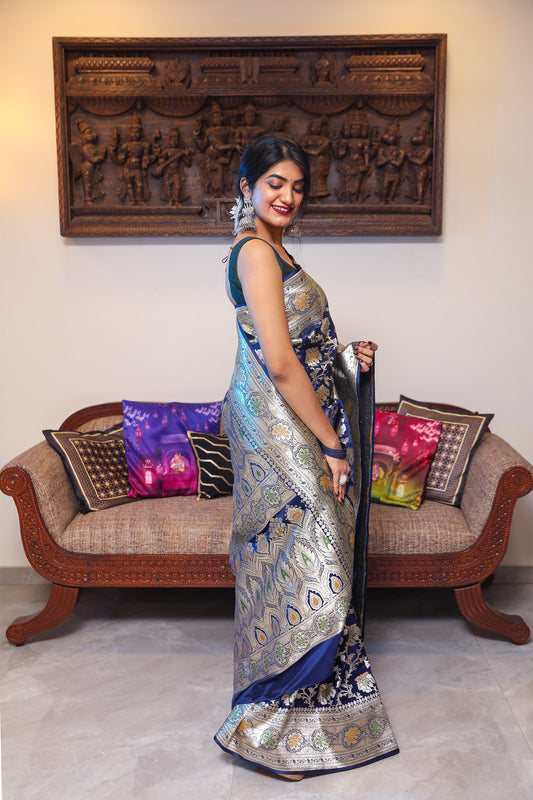 Deep Blue Katan Banarasi Silk Saree with Jaal Work