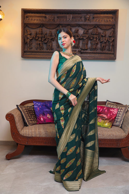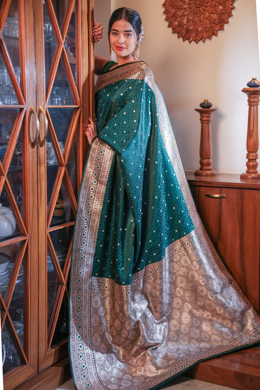 Royal Green Jamawar Banarasi Satin Silk Saree