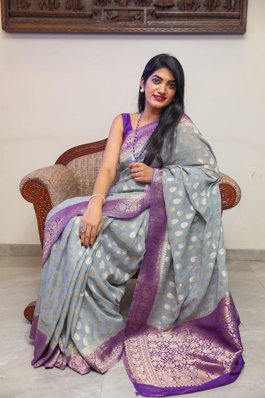 Steel Grey and Purple Banarasi Georgette Silk Saree