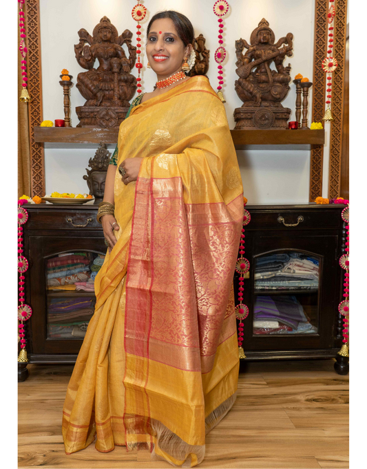 Red & Yellow Tussar Saree with subtle Zari Buttis