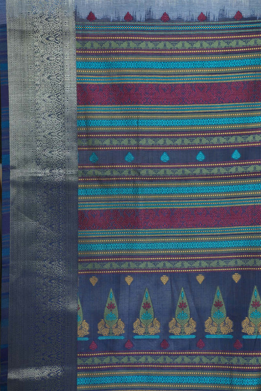 Weaving: The warp and weft threads are interlaced on traditional handlooms, creating intricate patterns and designs.