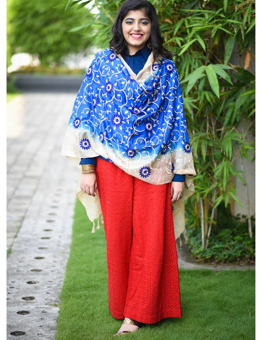 Tussar Blue And Natural Tussar Colour Dupatta With Embroidery All Over