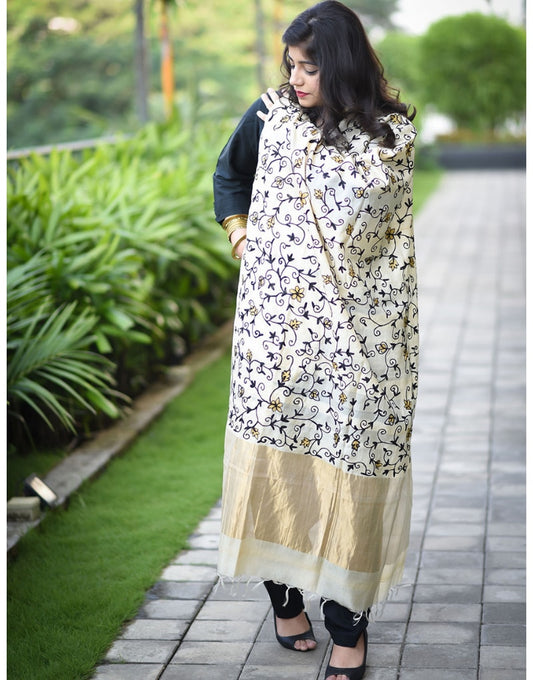 Tussar Dupatta With Black Embroidery With All Over Jaal
