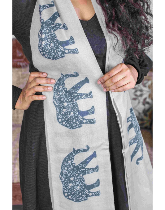 Creamish Grey Animal Print Stole with Elephants All Over