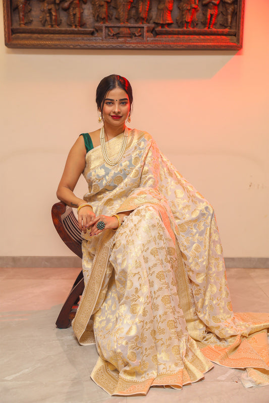 Creamy White Banarasi Georgette Silk Saree