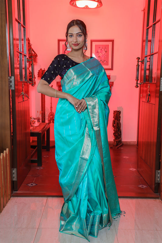 Deep Blue Katan Banarasi Silk Saree with Jaal Work