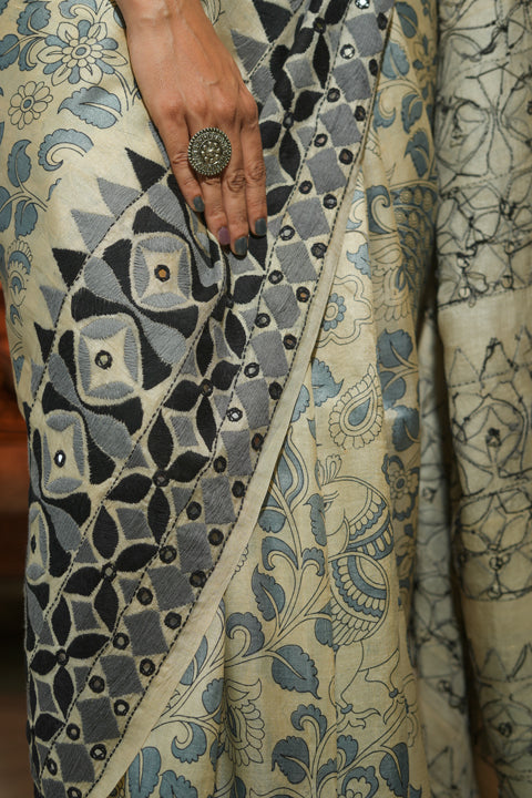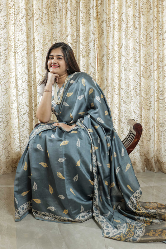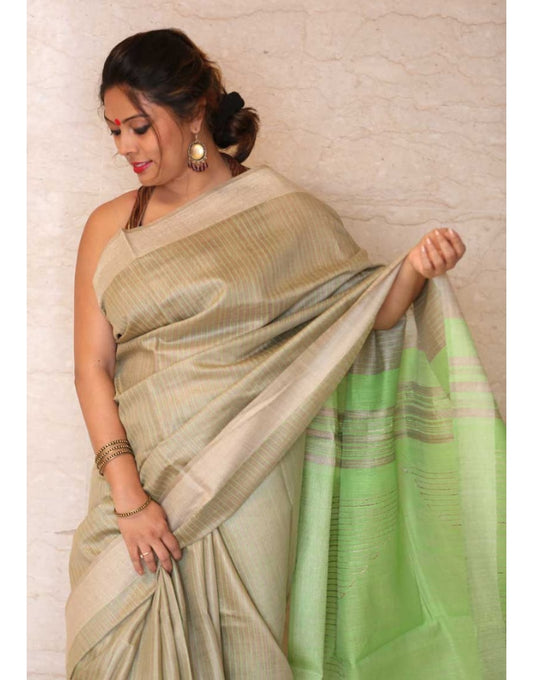 Grey and Pale Yellow Tussar Bishnupuri Silk Saree