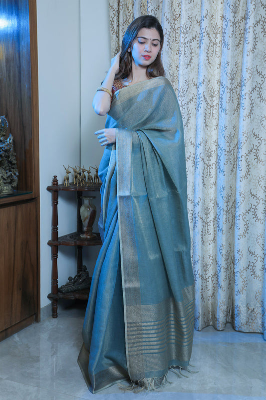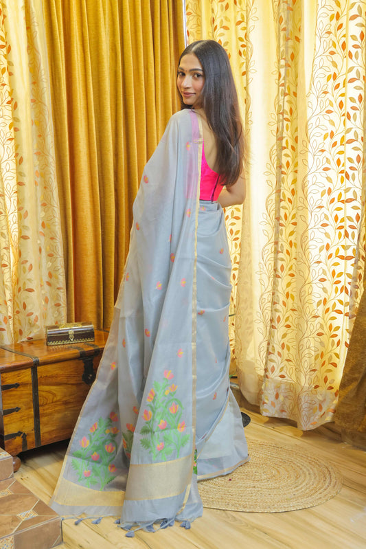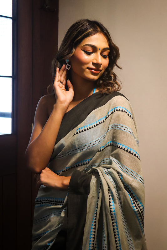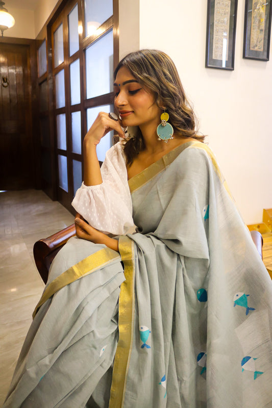 Grey, Blue, and White Handwoven Cotton Saree with Fishes