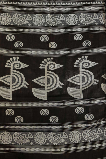 Artisanally crafted, this black cotton saree is adorned with white resham birds on the palla and scattered motifs throughout. An elegant, handcrafted piece with traditional charm.