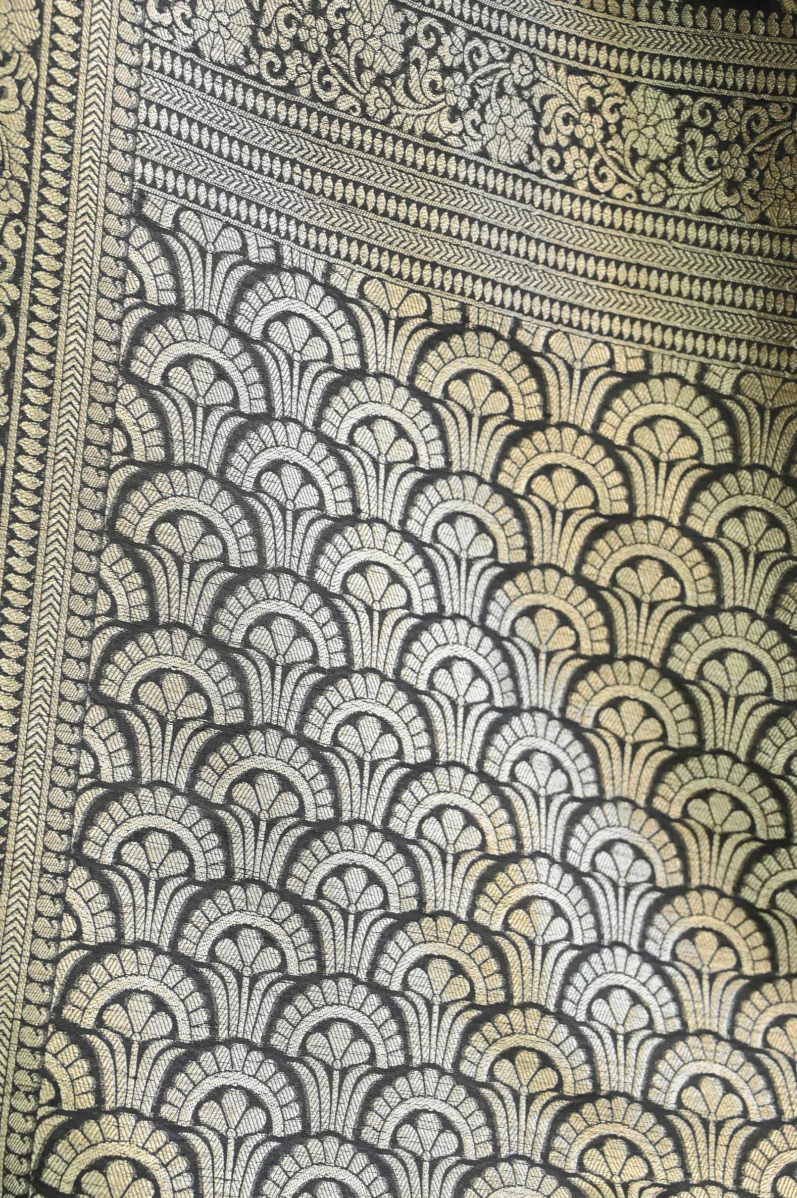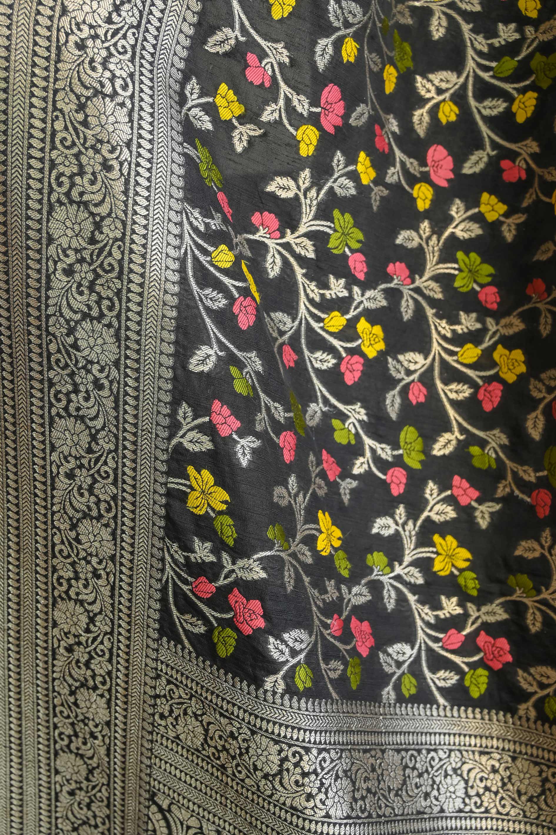 Elevate your elegance with this Black Katan Silk Banarasi Saree featuring intricate meenakari jaal in vibrant yellow, red, and green floral patterns, accentuated by shimmering silver zari. The heavy pallu with silver zari work adds a rich, opulent touch, while the plain blouse with a subtle border perfectly balances the design. Ideal for special occasions, this saree combines traditional craftsmanship with timeless style.