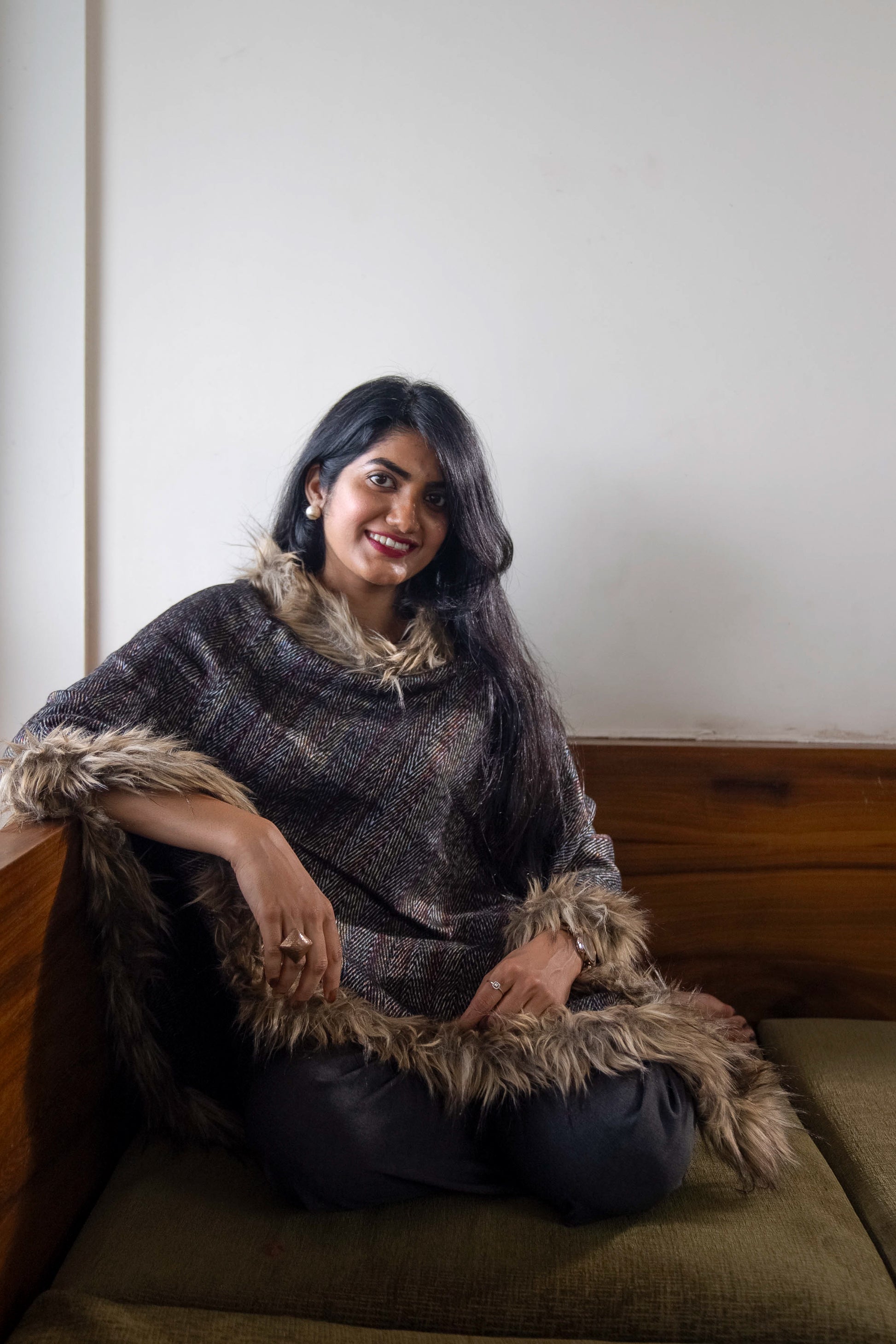 Elevate your winter wardrobe with this sophisticated Black Mohair Wool Poncho, crafted from luxuriously soft mohair wool in a striking black hue. The piece features an intricate knitted pattern that adds visual depth and texture, while premium fur accents along the edges create an understated yet refined elegance. Designed for effortless layering, this versatile poncho drapes beautifully over any outfit, offering both warmth and timeless style. Perfect for those who appreciate quality craftsmanship and contemporary fashion sensibility.