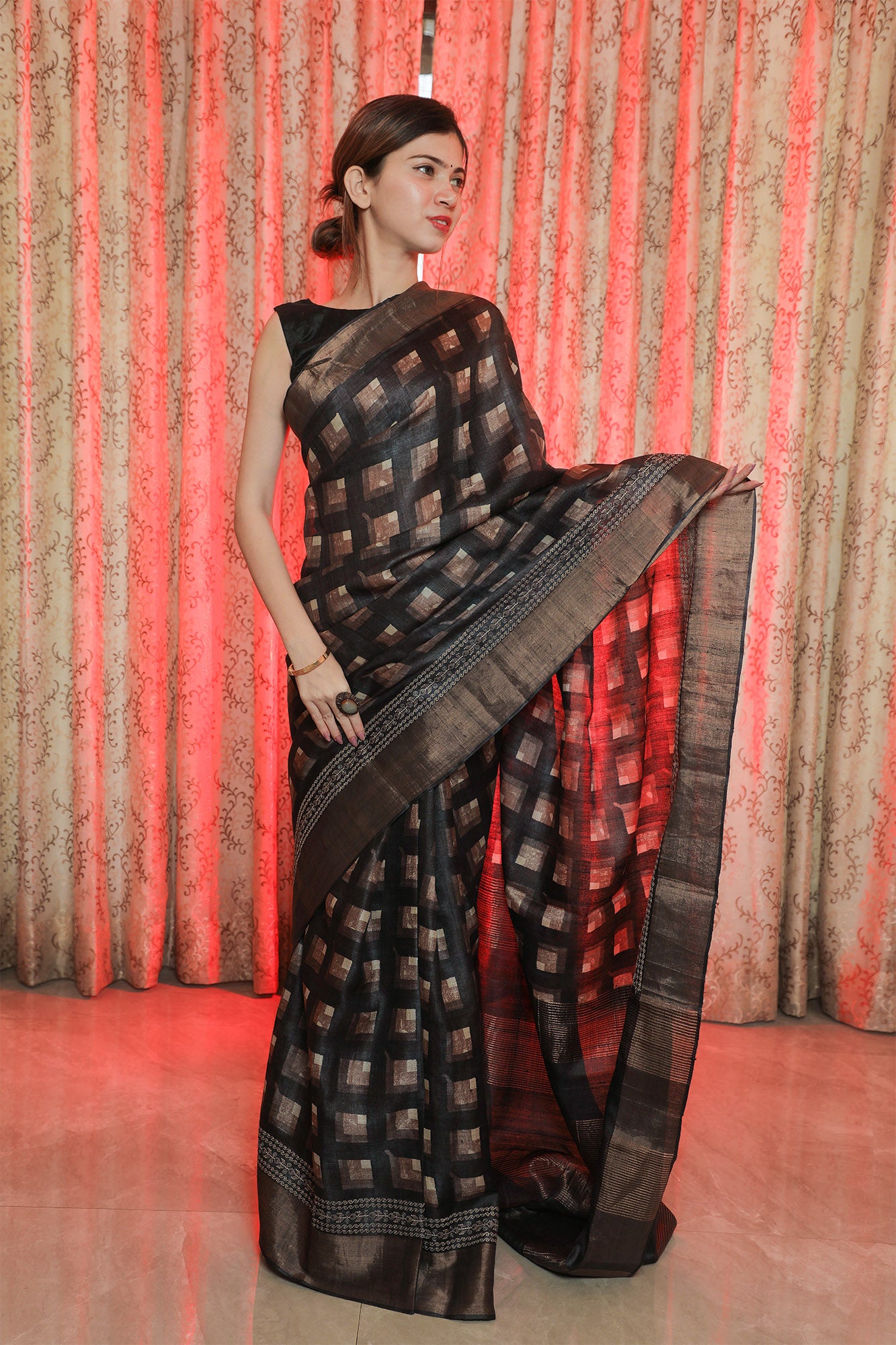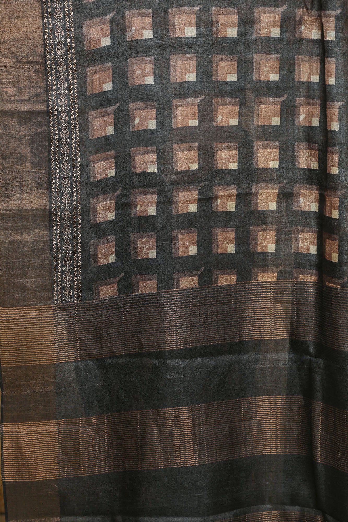 A stunning black Tussar handwoven saree featuring cream, brown, and black colors with machine embroidery on the border. The saree is adorned with hand block squares and comes with a striped palla and blouse.