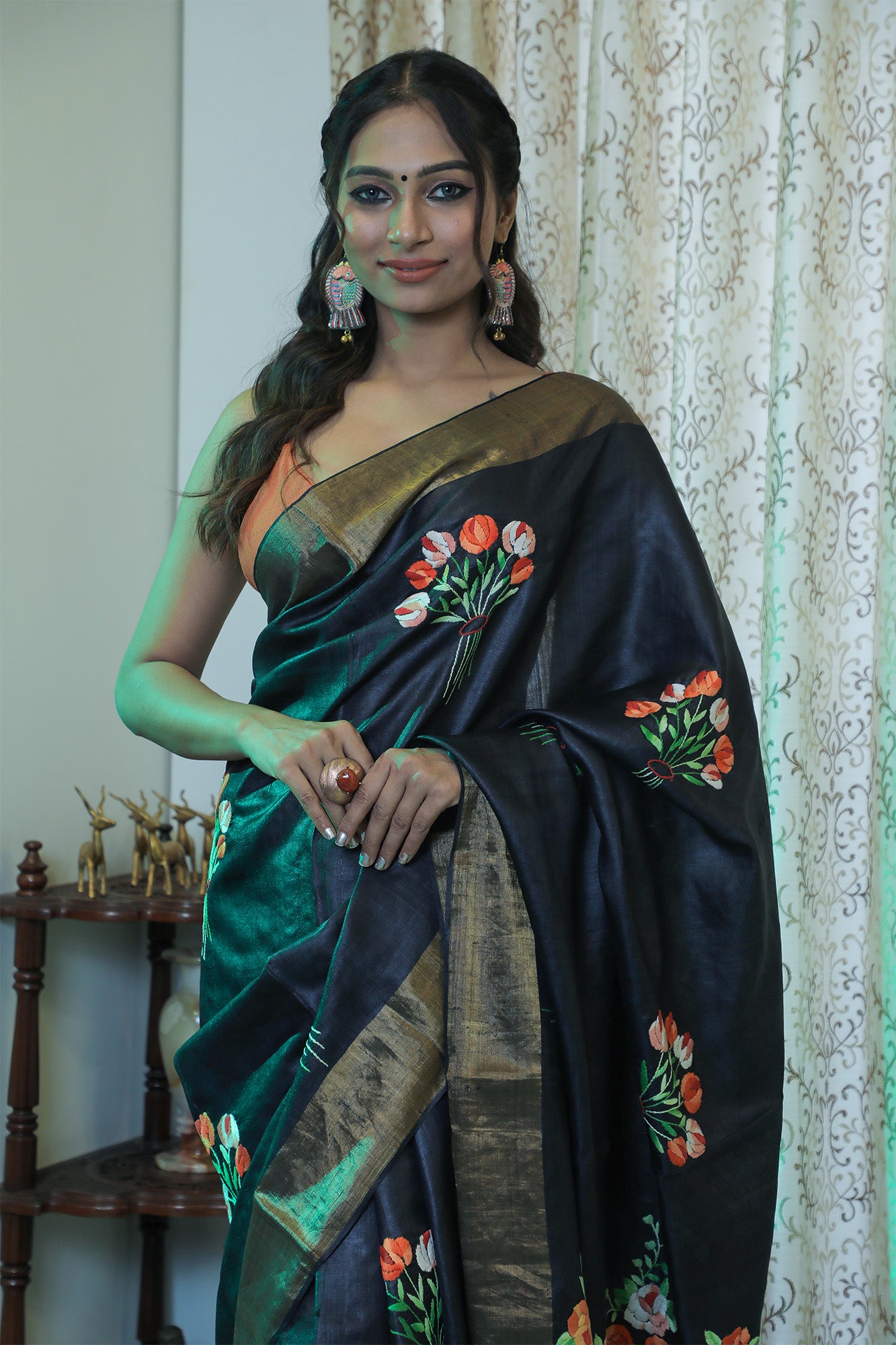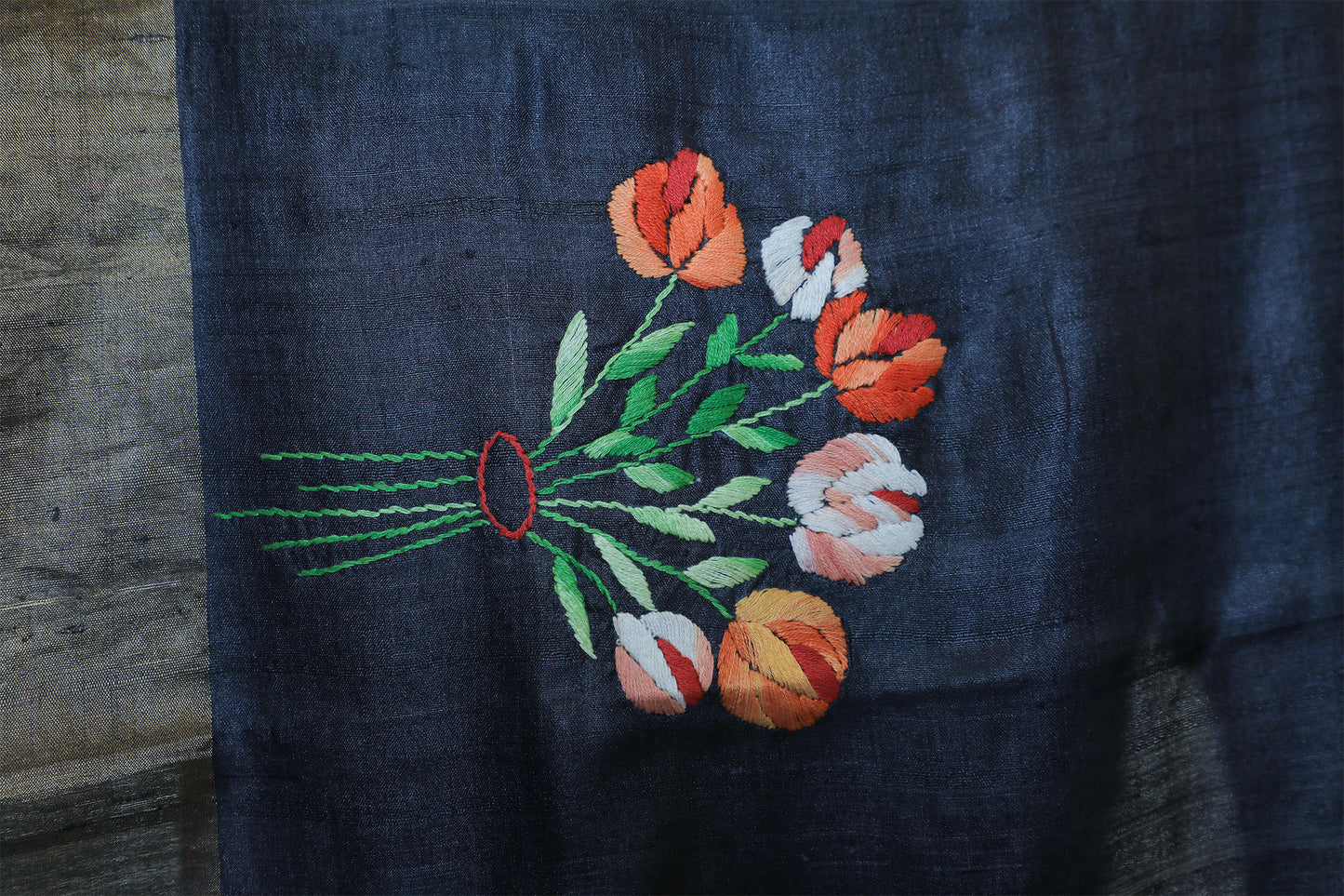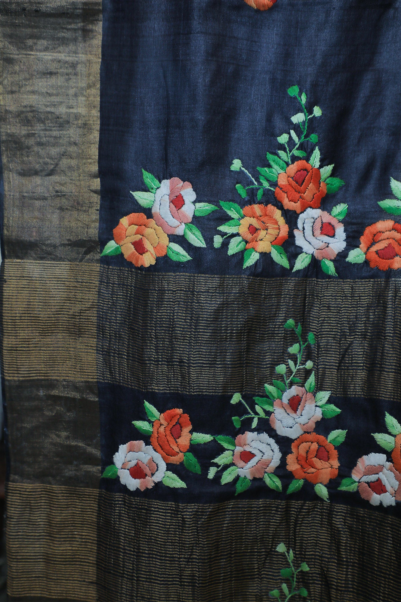 A classic black Tussar saree with intricate hand-embroidered Parsi work. The black base adorned with vibrant orange flowers creates a striking contrast. The saree comes with a blouse featuring matching embroidery.