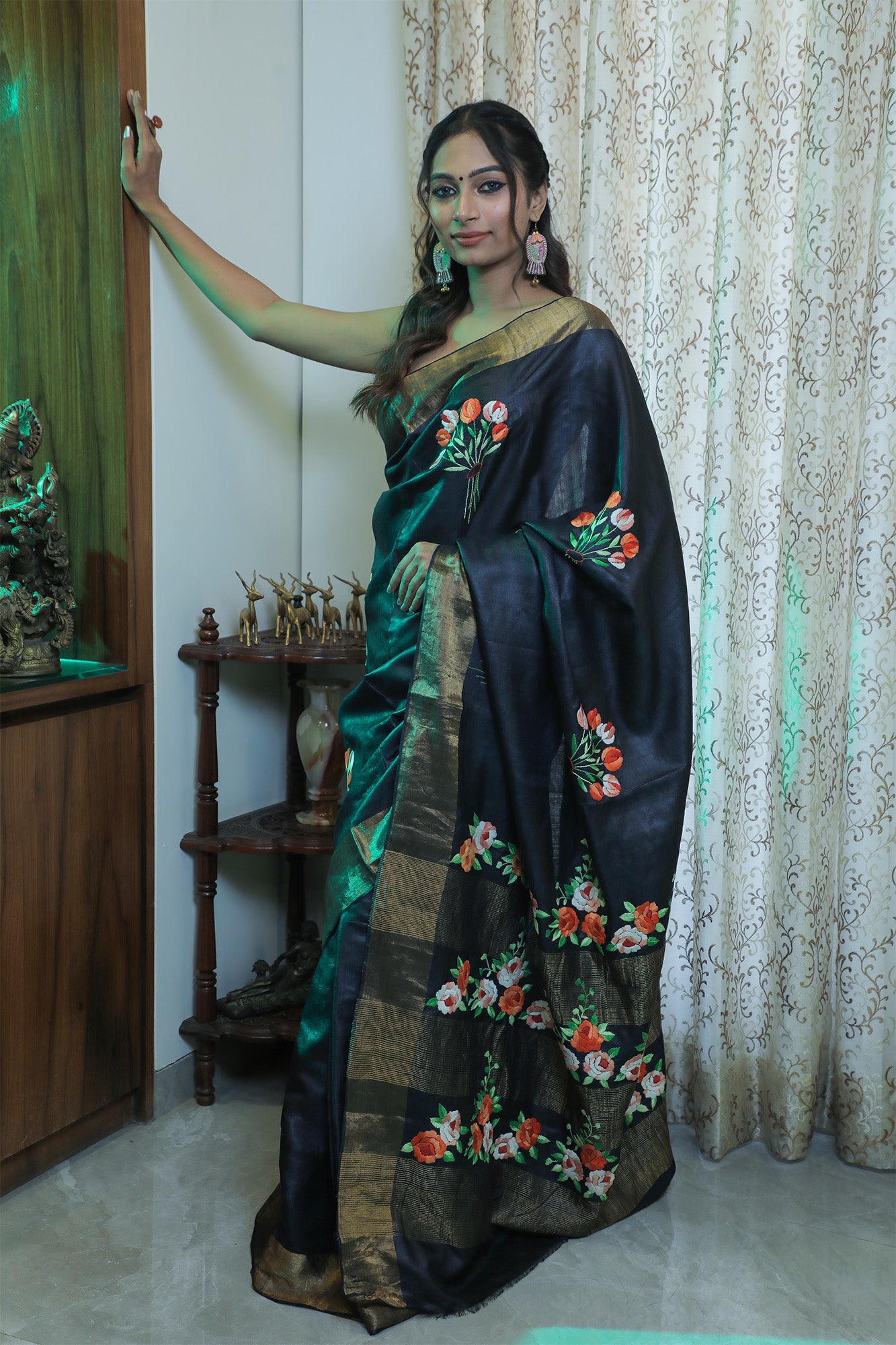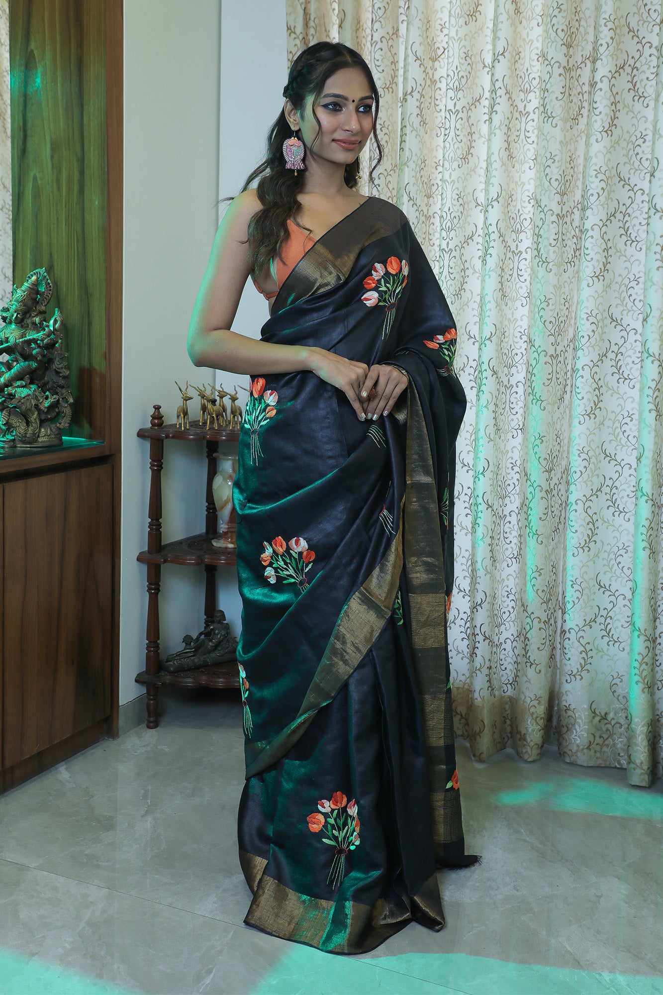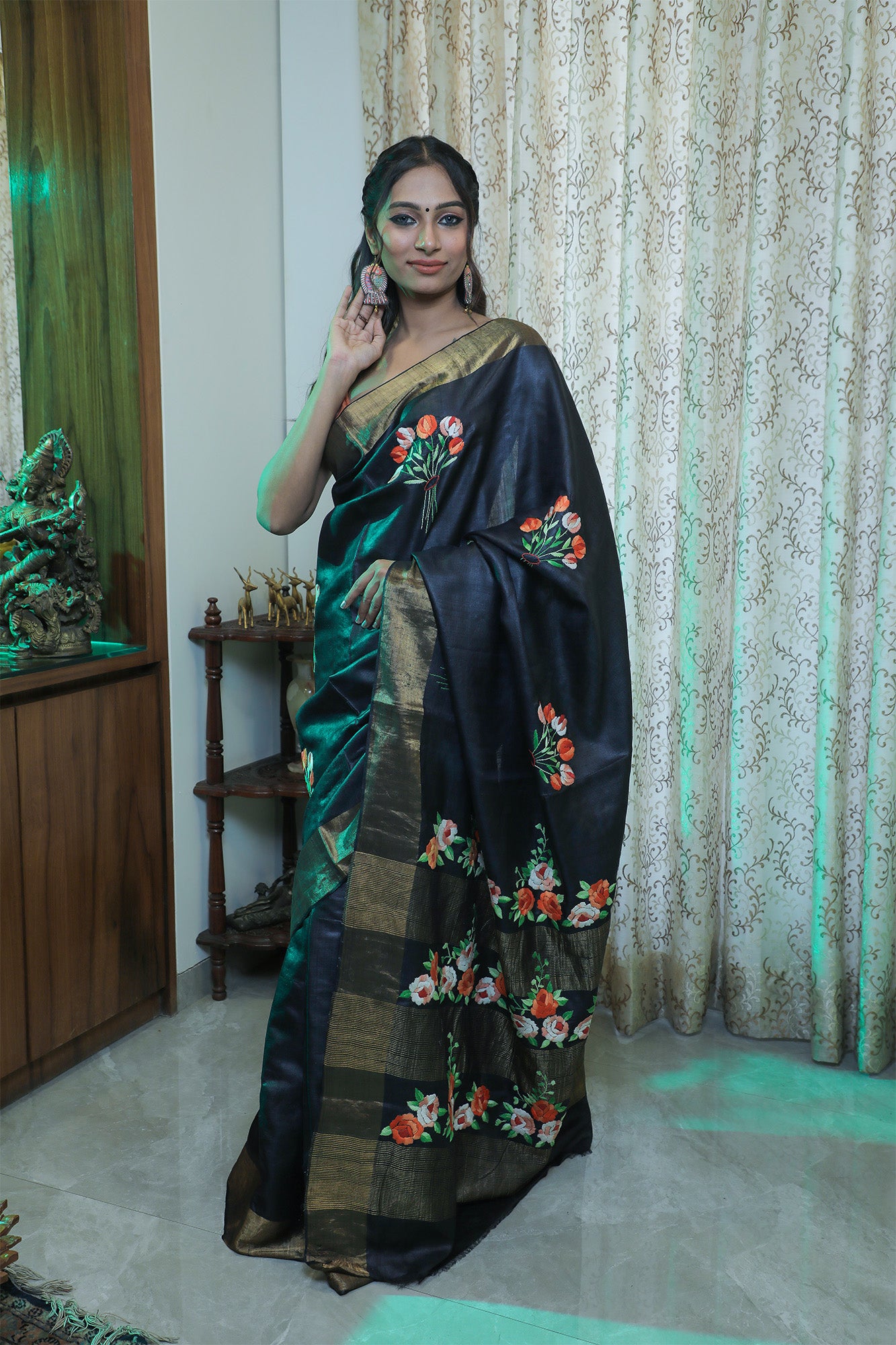 A classic black Tussar saree with intricate hand-embroidered Parsi work. The black base adorned with vibrant orange flowers creates a striking contrast. The saree comes with a blouse featuring matching embroidery.