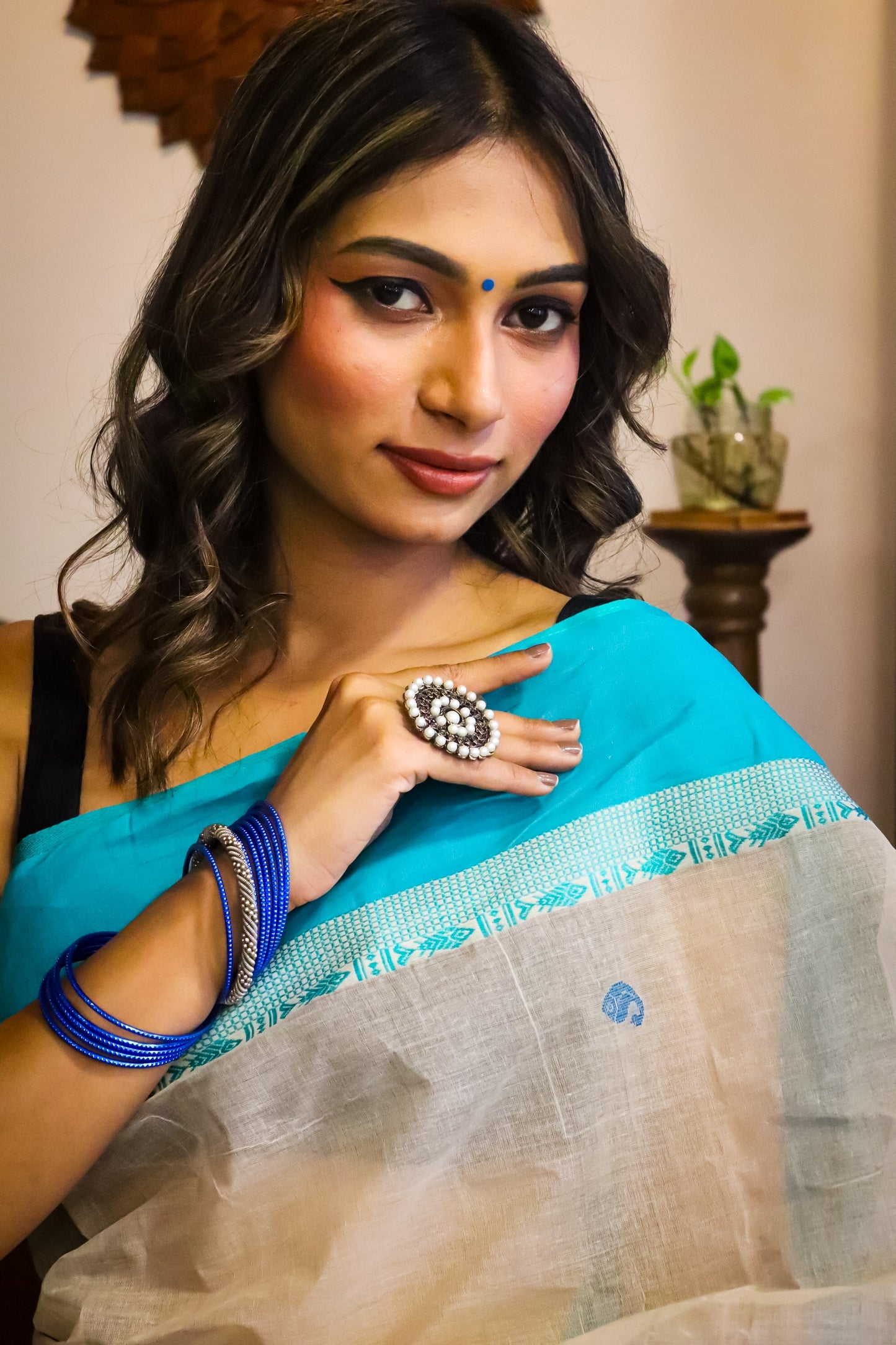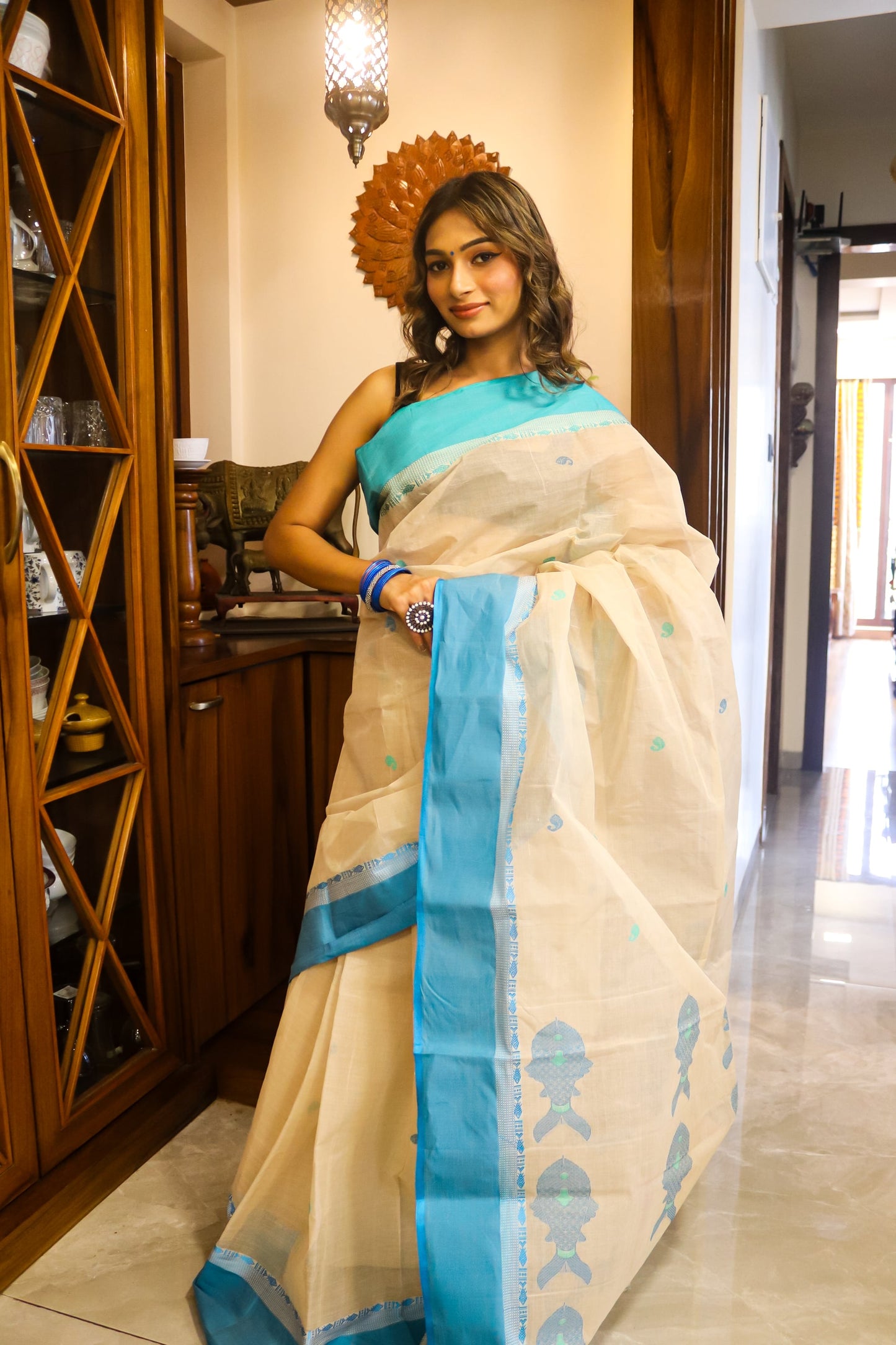 Elevate your style with this elegant handwoven Soft Cotton saree. Featuring a striking blue and beige combination and a unique fish pattern on the palla and all-over saree, this saree is perfect for any occasion. The Ganga Jamuna borders are highlighted with shades of blue.