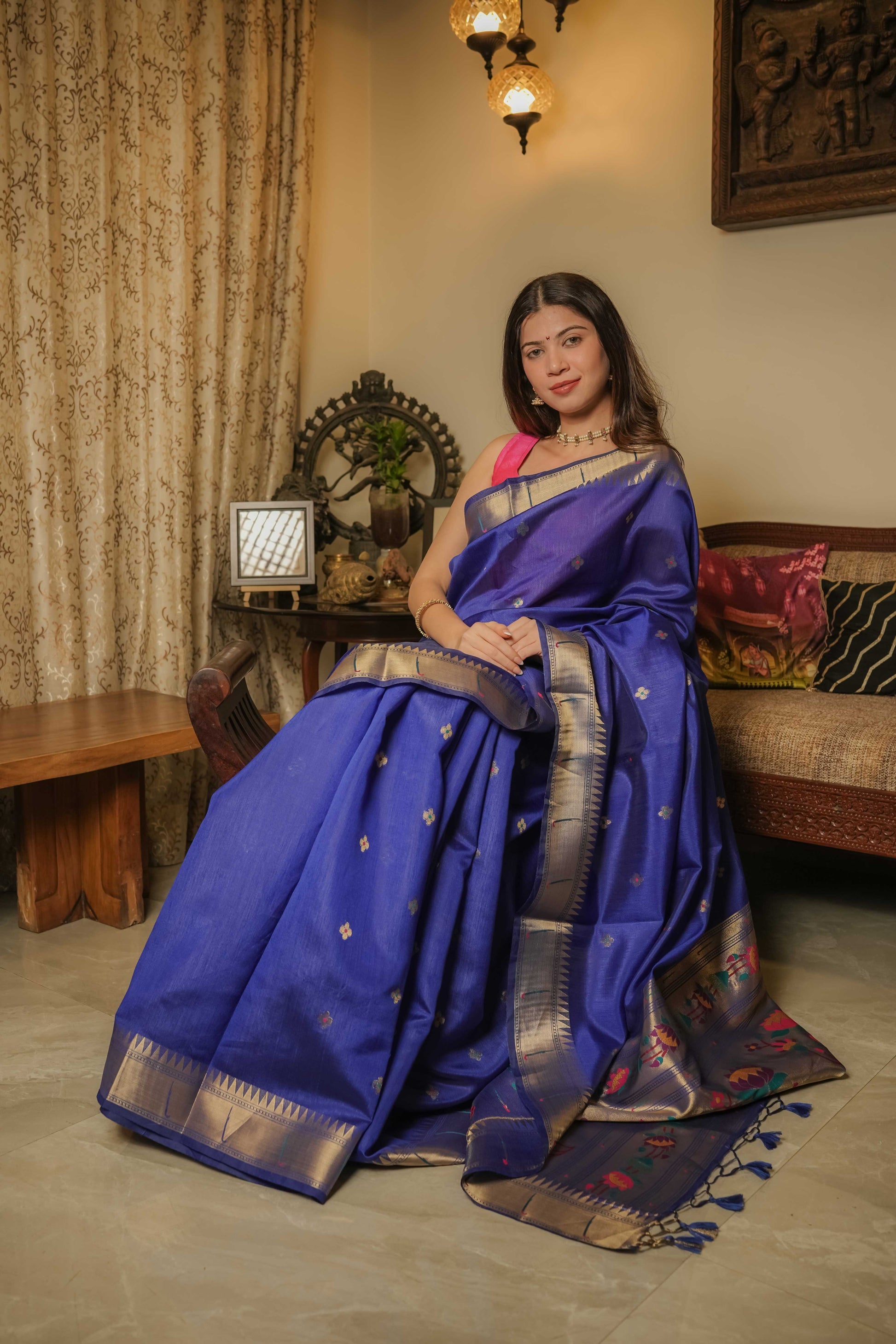 Cotton silk Paithani blue saree with Munia border, meenakari motifs, and signature heavy Paithani palla.