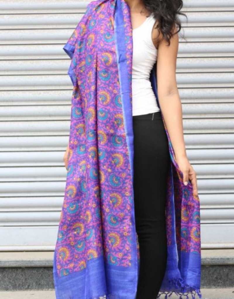 Blue Tussar dupatta with a jaal pattern and magenta, blue and yellow flower design.