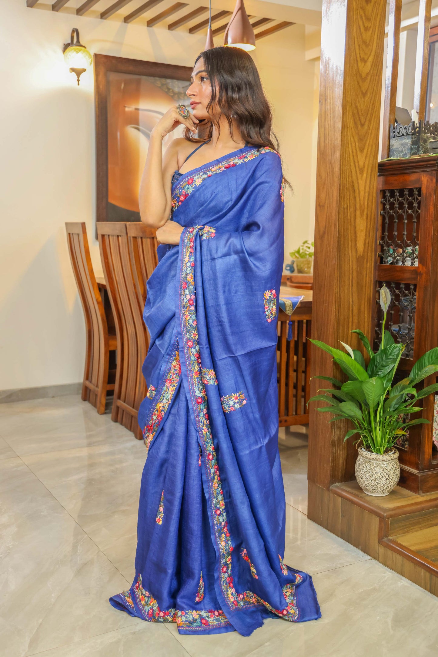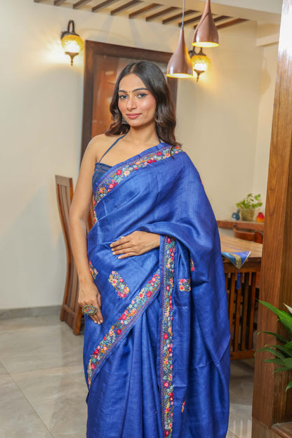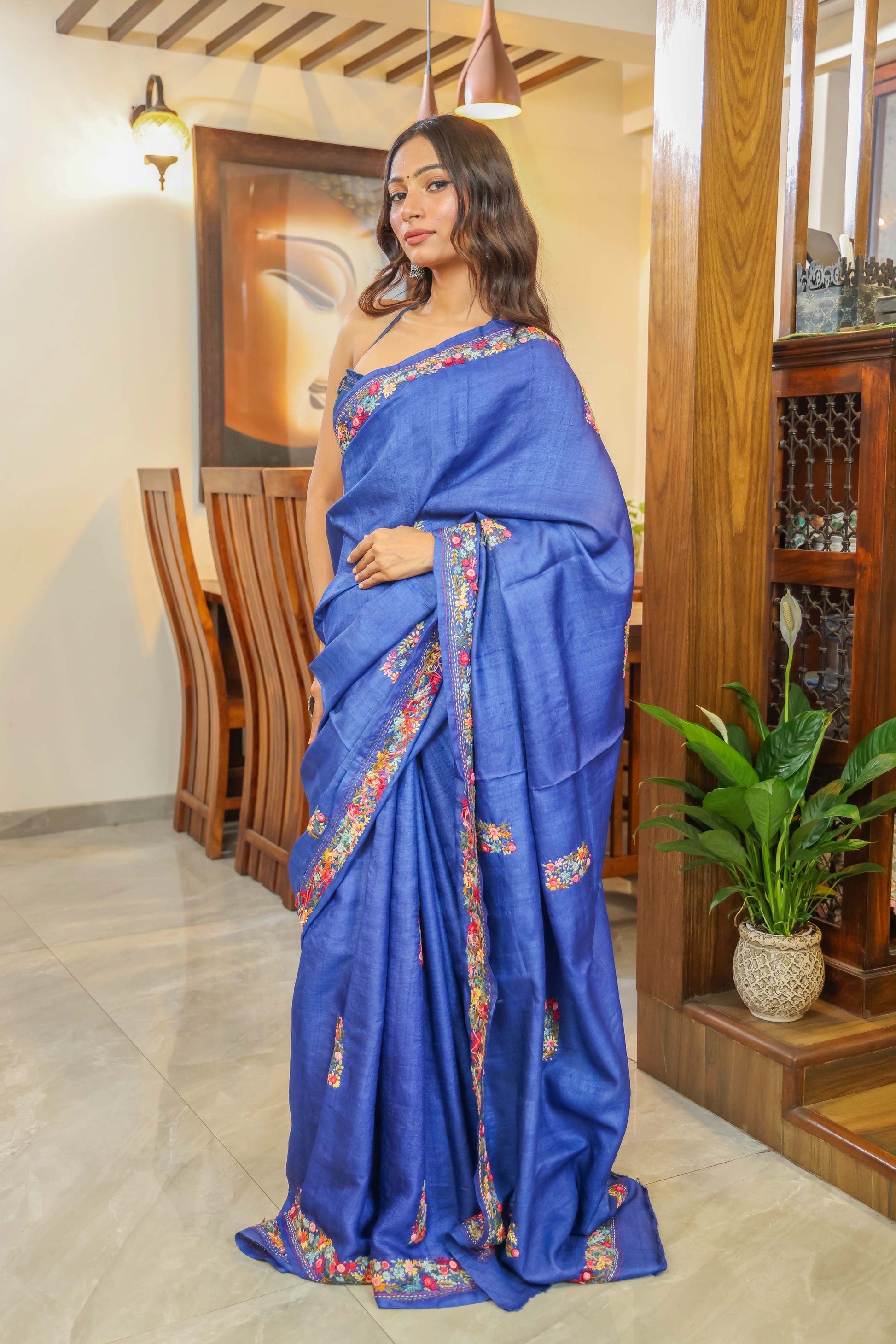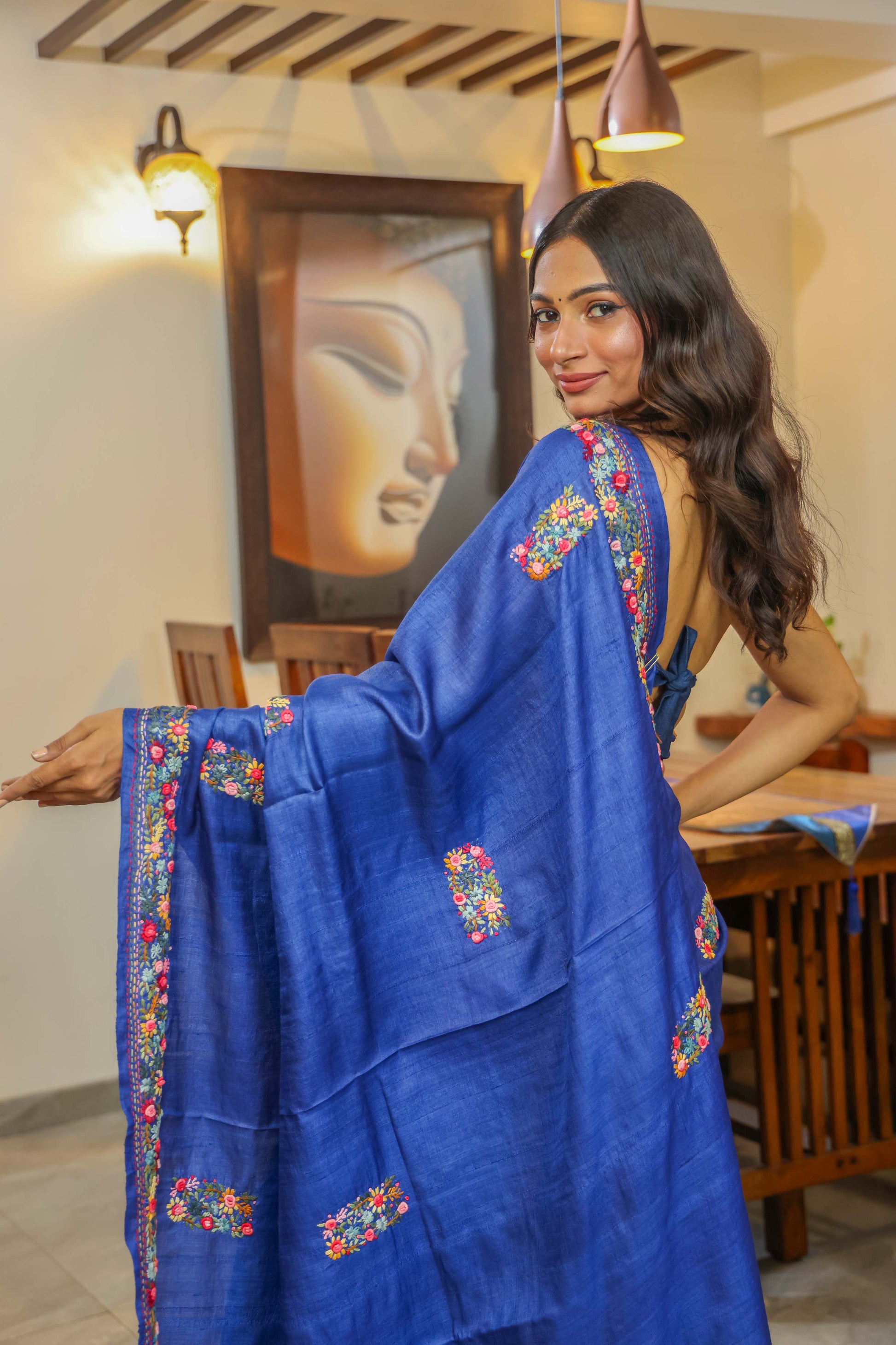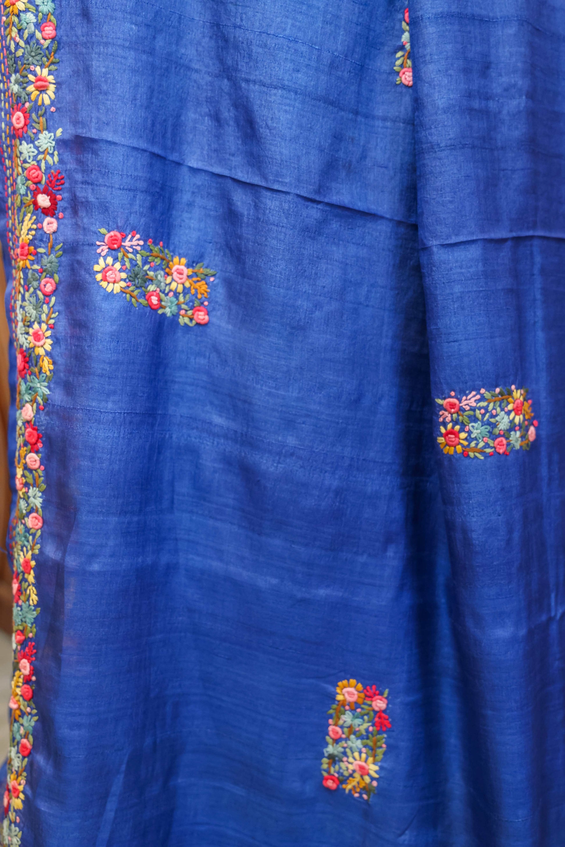 Handcrafted blue tussar saree with traditional Parsi embroidery in yellow, green, pink, and peach silk threads. Intricate border and all-over motifs make it a standout.