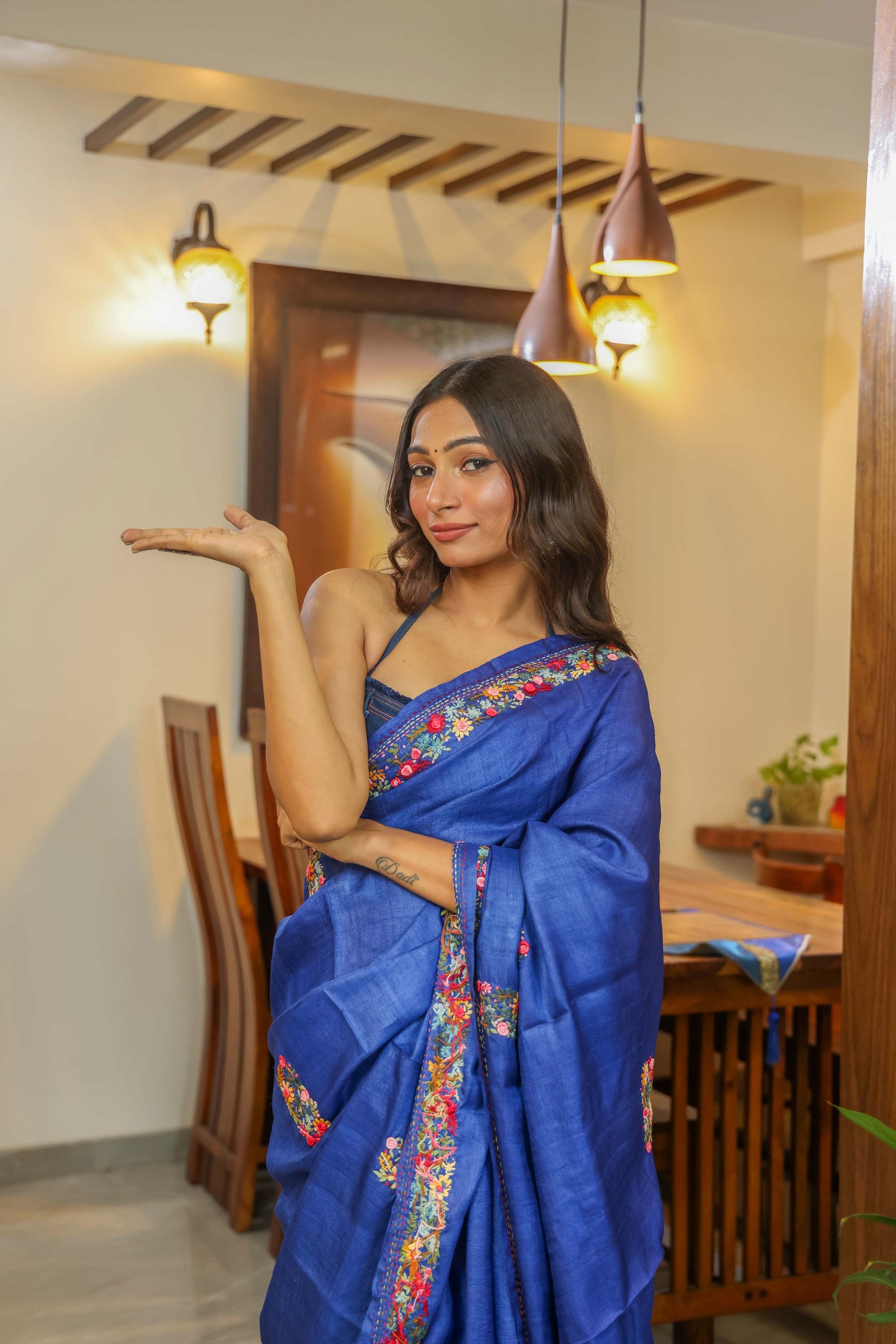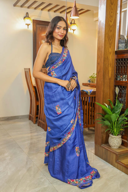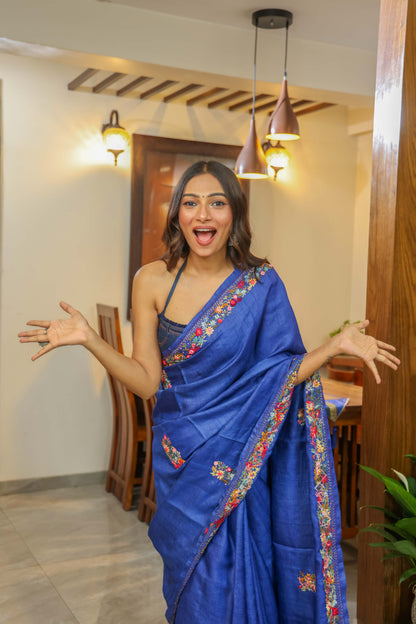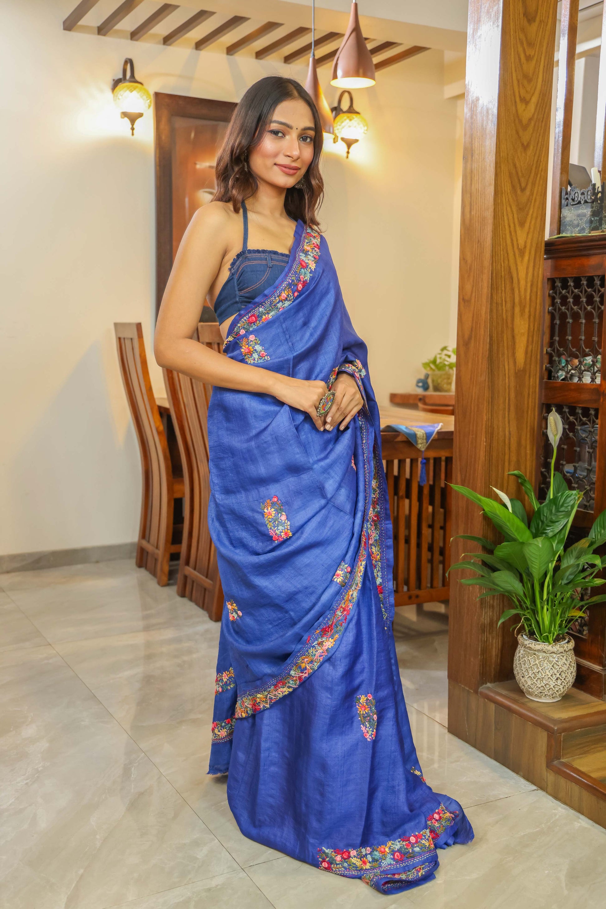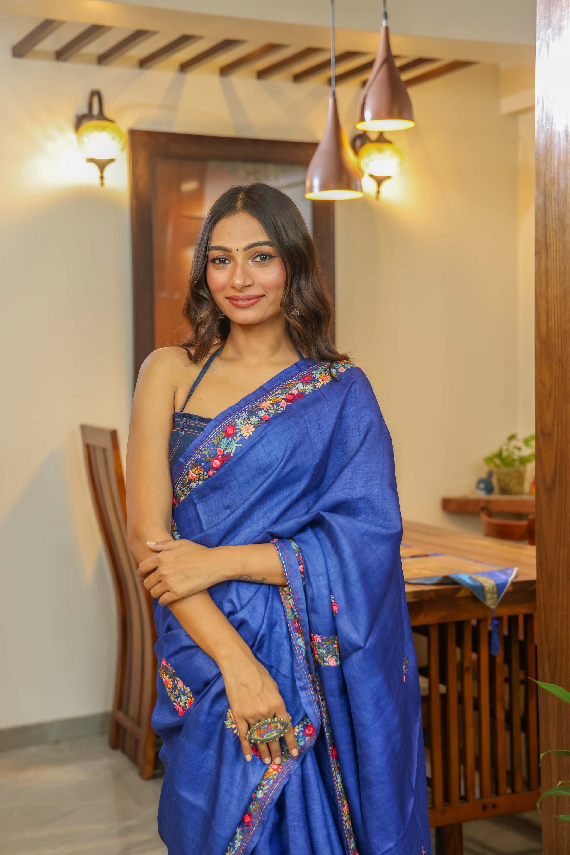 Handcrafted blue tussar saree with traditional Parsi embroidery in yellow, green, pink, and peach silk threads. Intricate border and all-over motifs make it a standout.