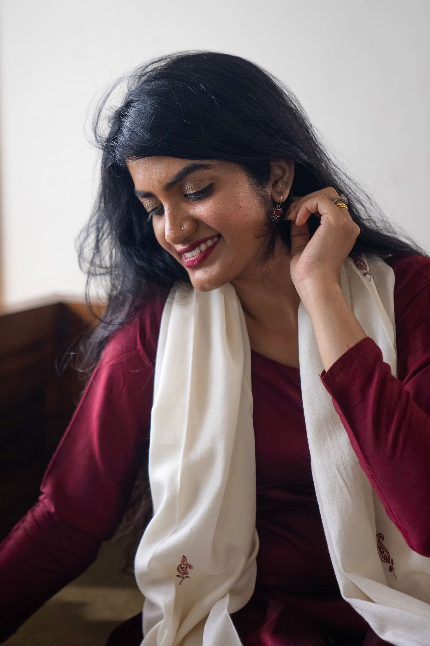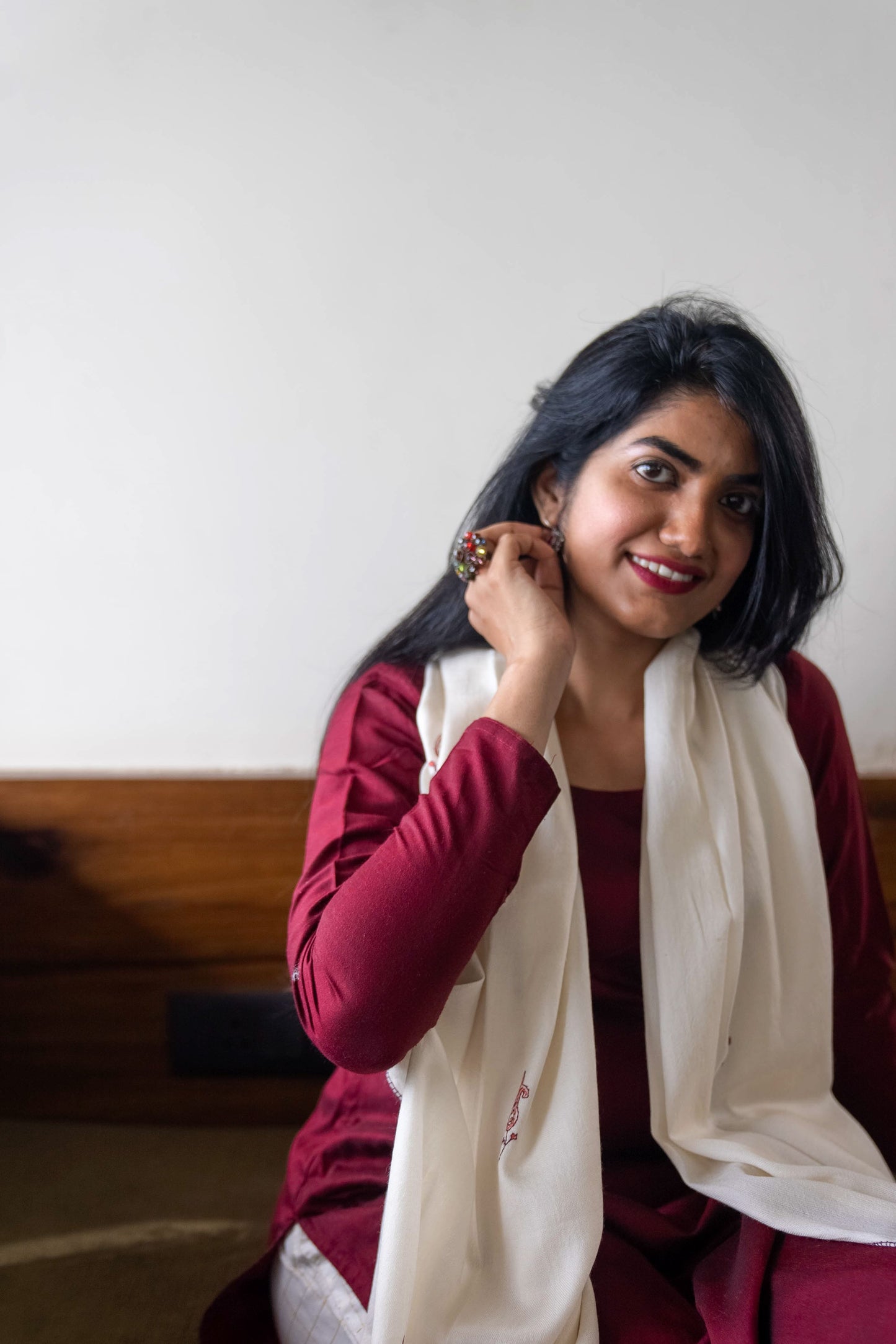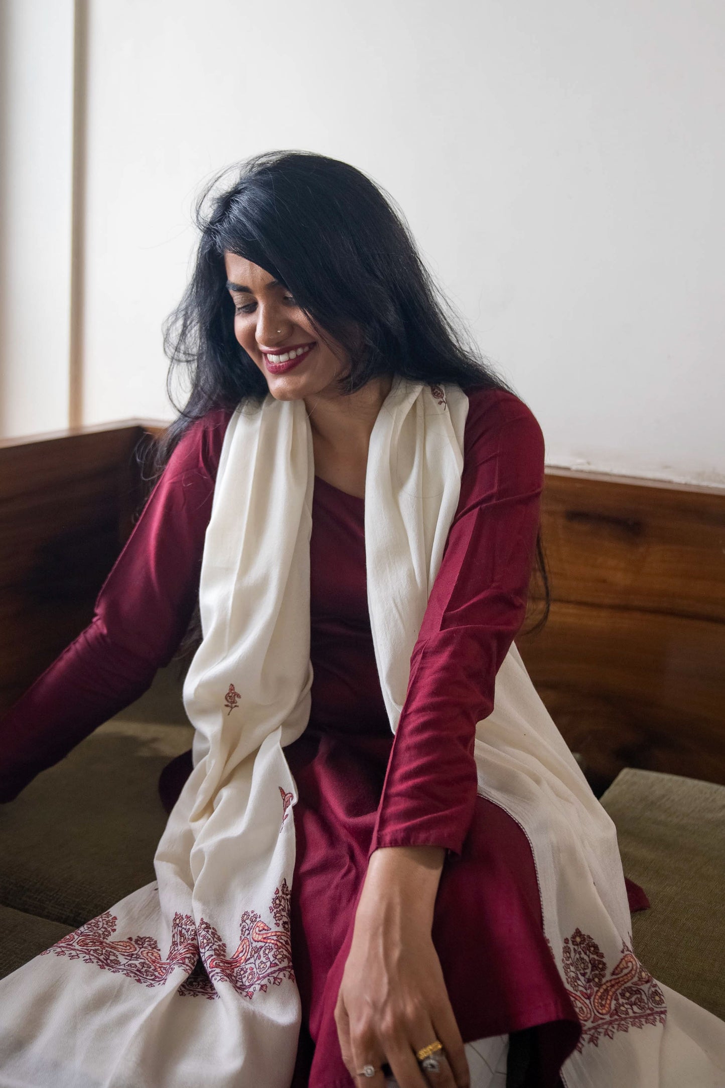 Elevate your wardrobe with this exquisite cream Pashmina stole, adorned with delicate Sozni hand embroidery. Featuring intricate motifs crafted using fine brown and maroon resham threads, this stole is a timeless piece of art. The beautifully embroidered border enhances its elegance, making it perfect for both casual and formal occasions.