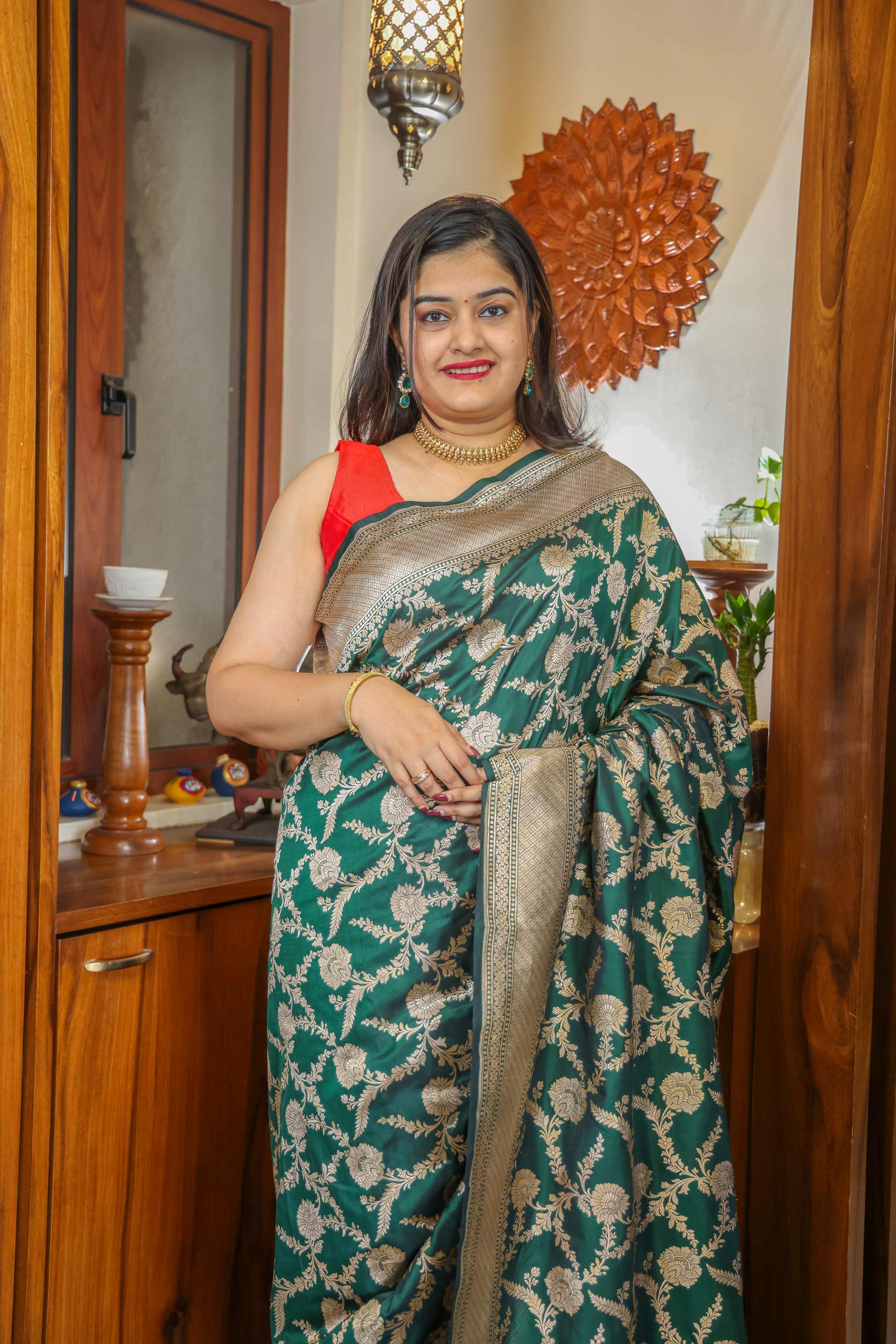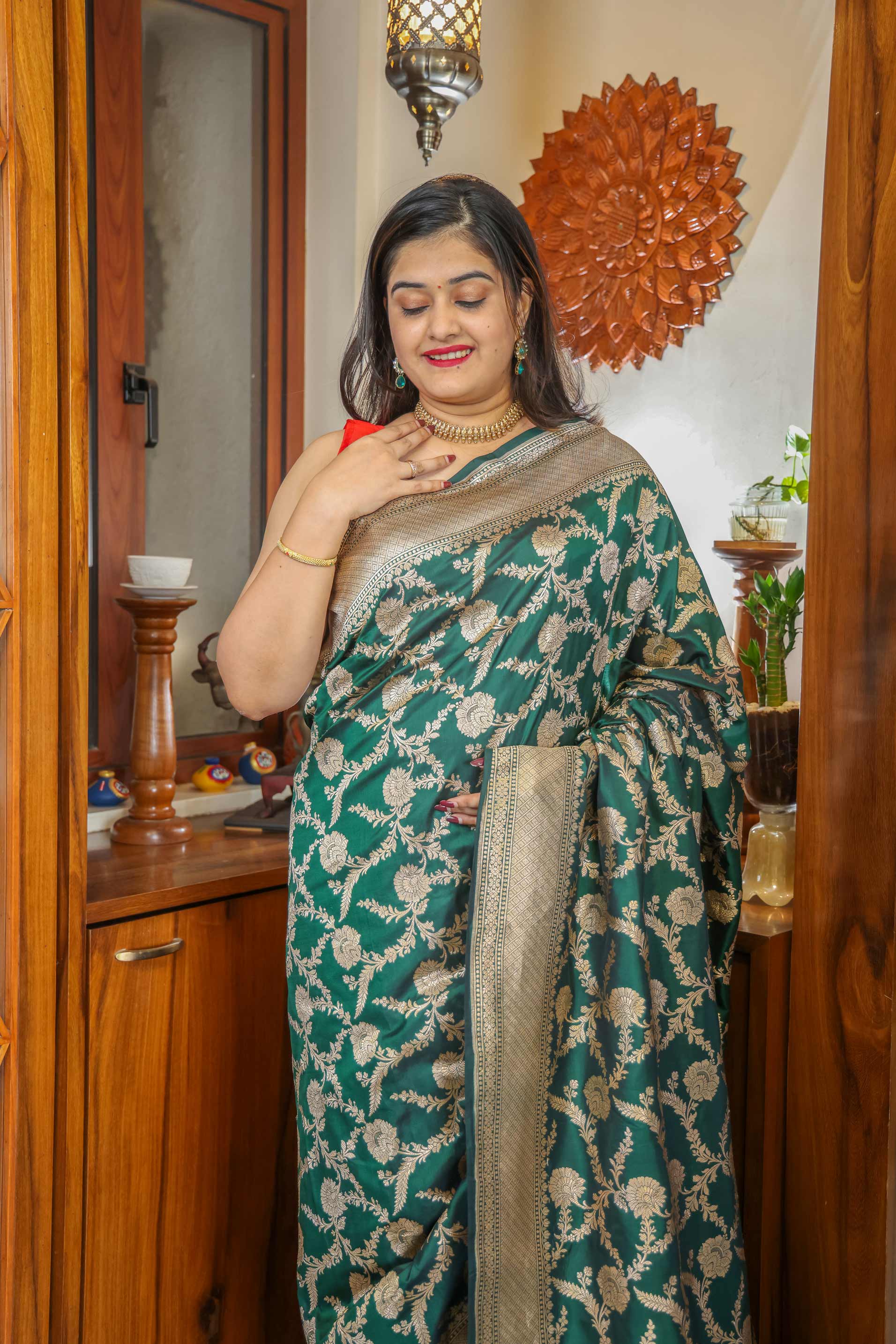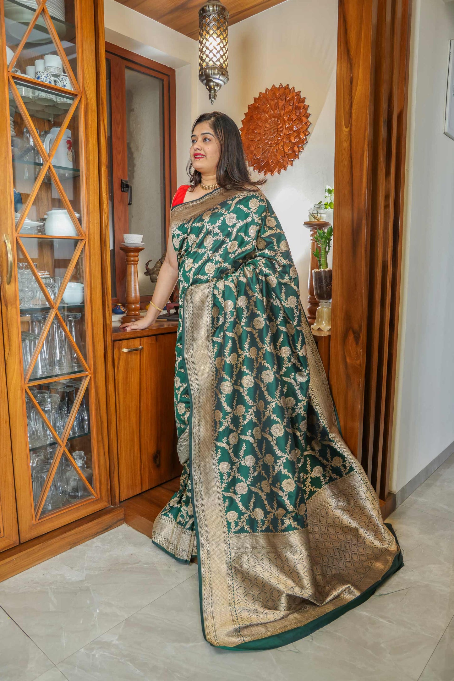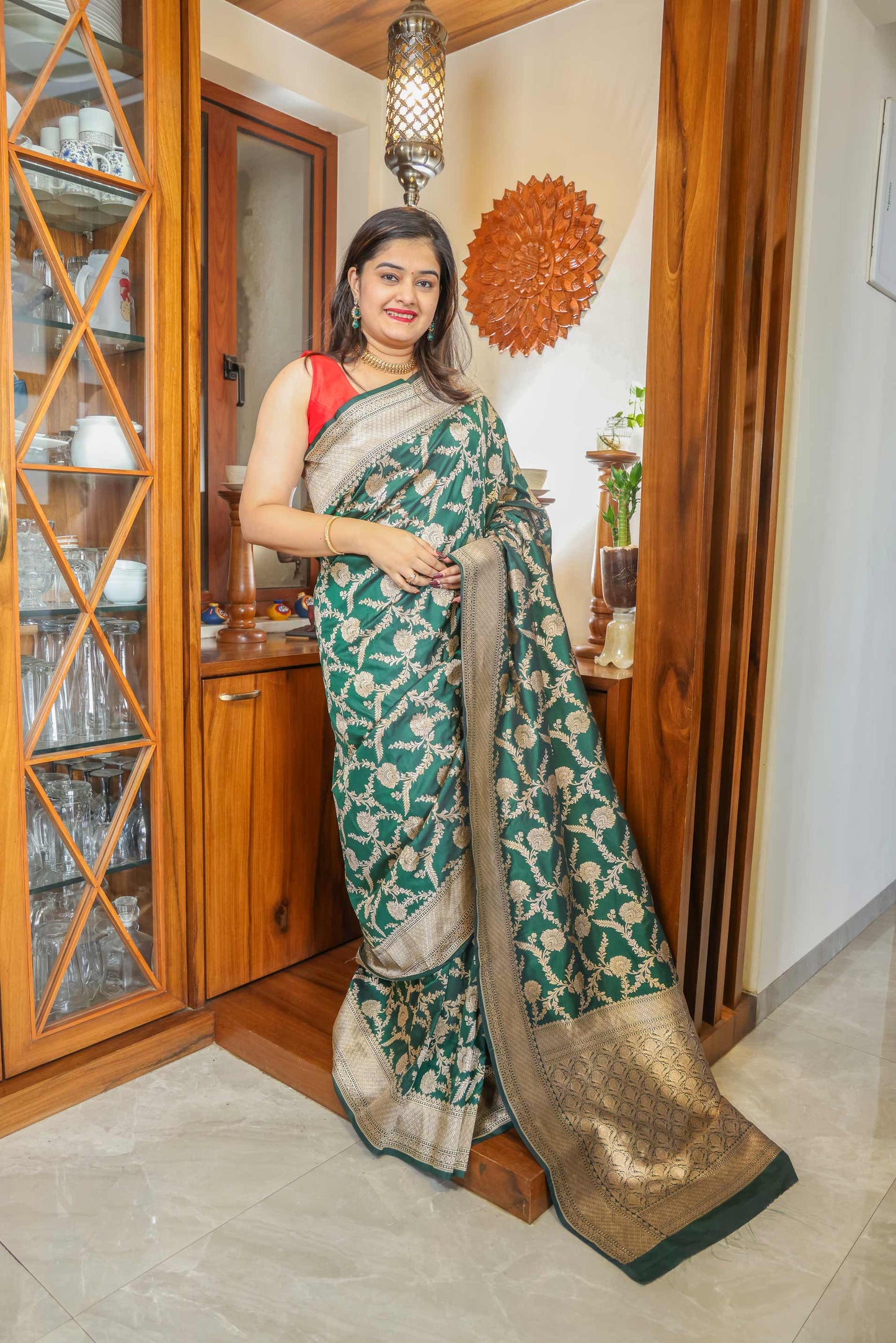 This royal dark green Katan silk saree is a timeless piece with intricate jangla pattern, enhanced by rich zari work. Comes with a heavy border and palla.