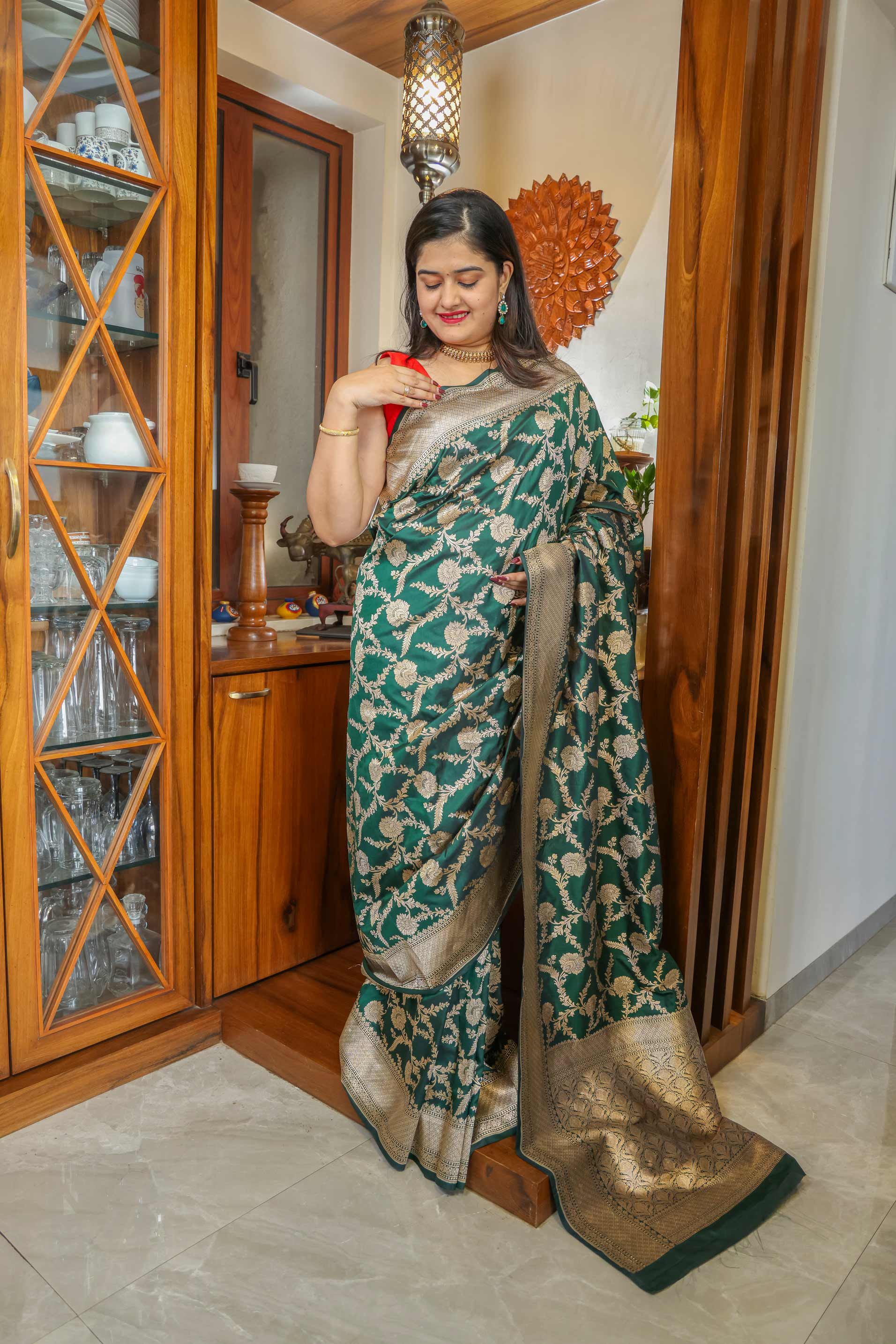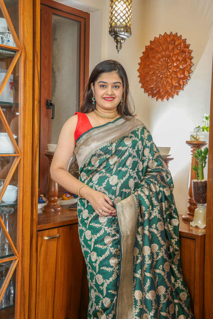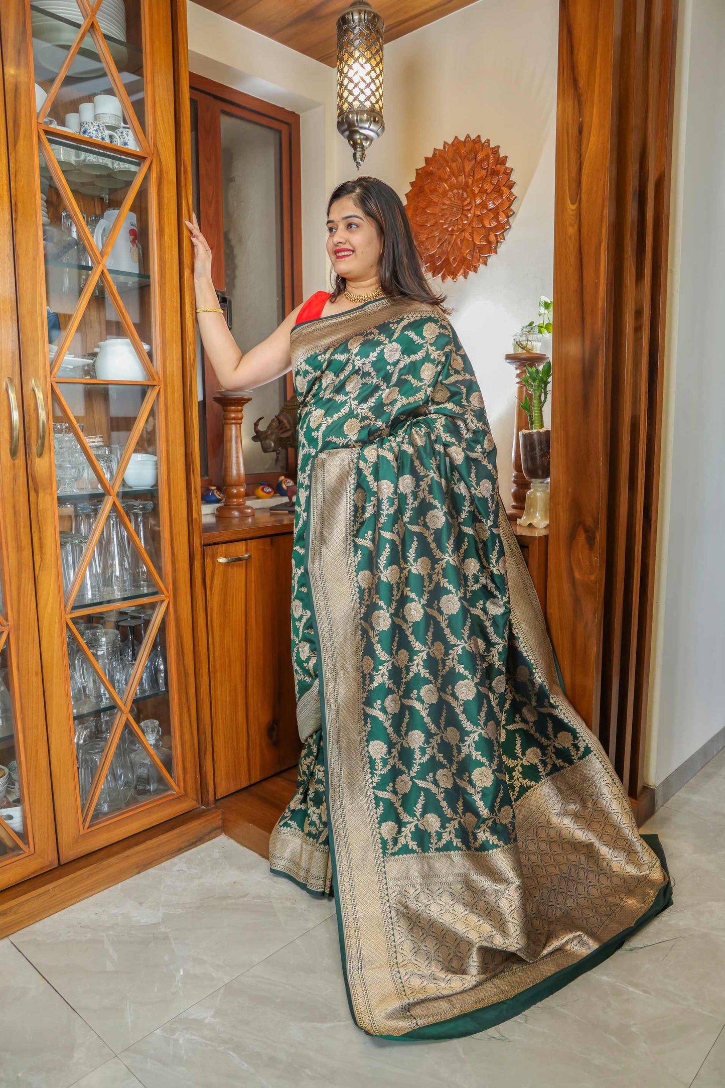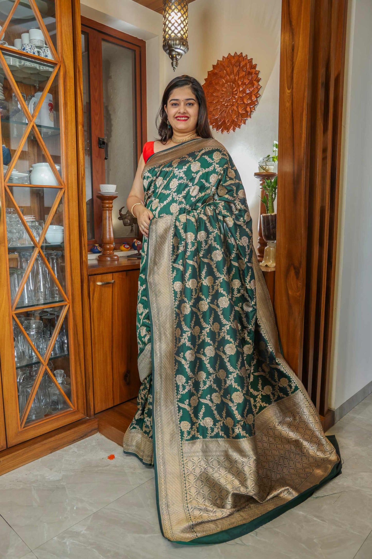 This royal dark green Katan silk saree is a timeless piece with intricate jangla pattern, enhanced by rich zari work. Comes with a heavy border and palla.