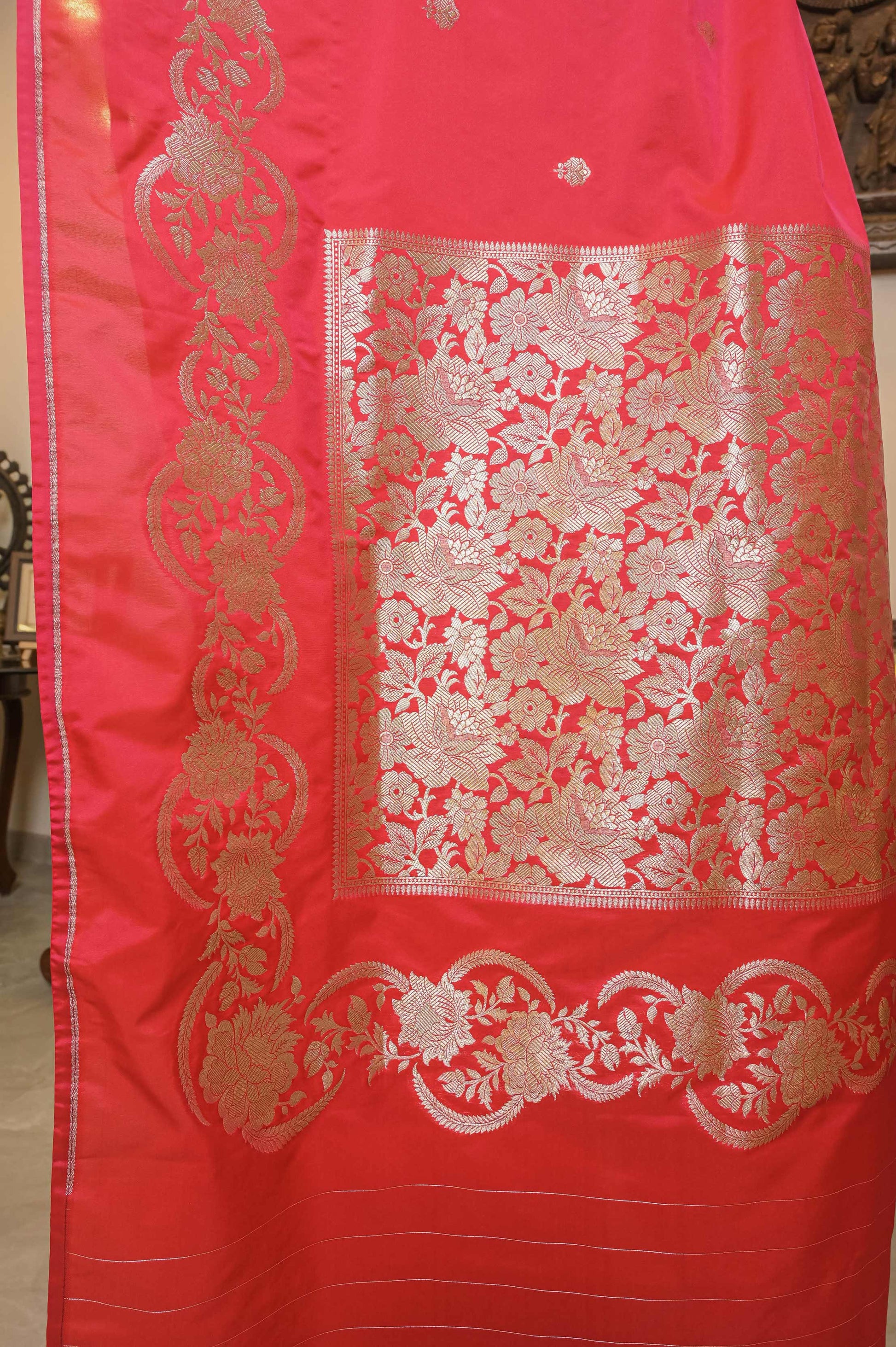 This Fuschia Pink handcrafted silk saree features exquisite zari flower motifs across its base, a beautifully detailed zari bel border, and a richly decorated pallu. The matching blouse with zari lines and bel on the sleeves completes this elegant ensemble, perfect for special occasions.