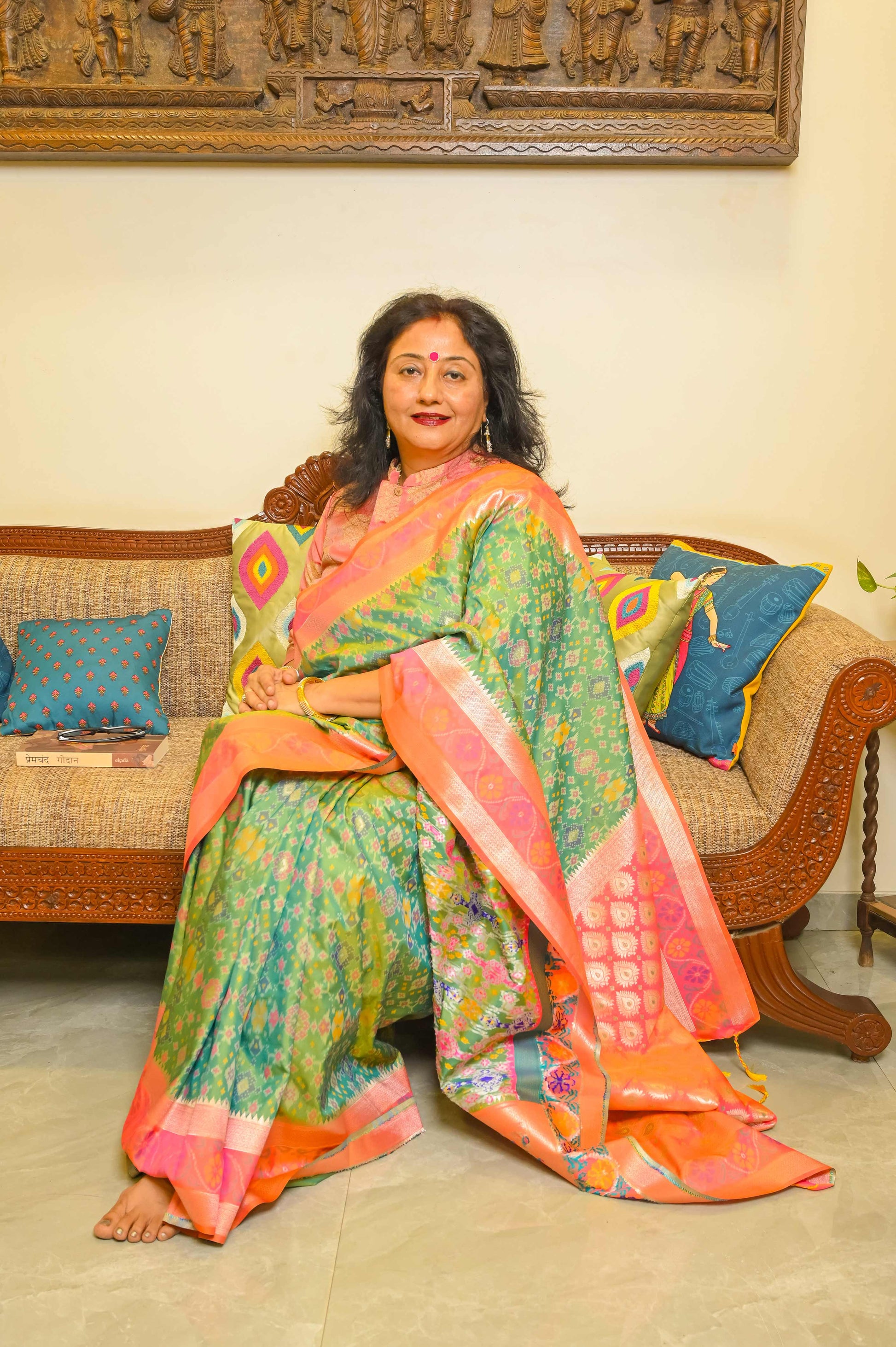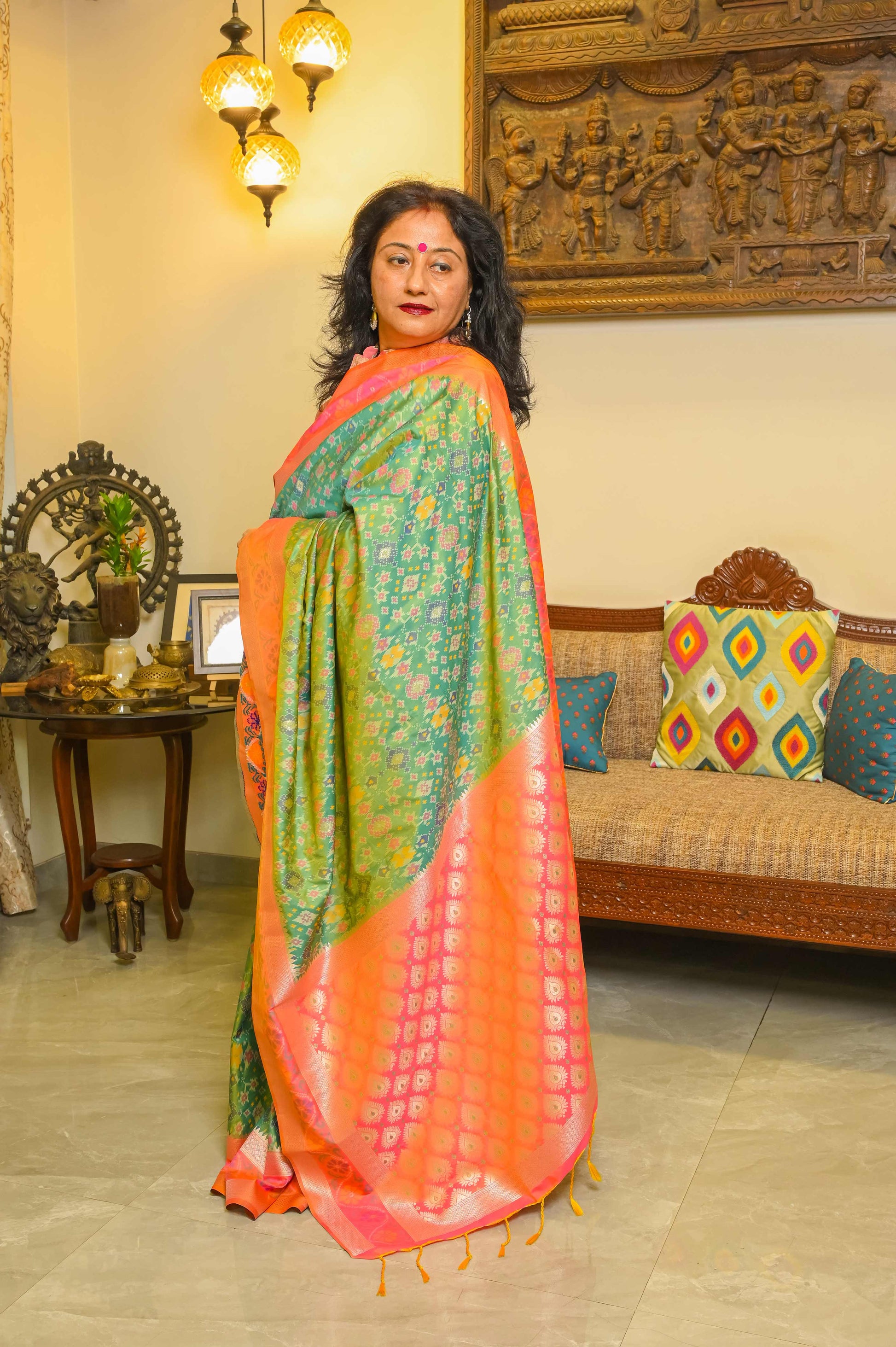 This elegant green and peachish pink Patola saree features delicate zari motifs on the palla and a stunning Patola border that adds traditional charm. The plain blouse with a contrasting color and zari bordered sleeves perfectly complements the saree, making it a timeless choice for special occasions.