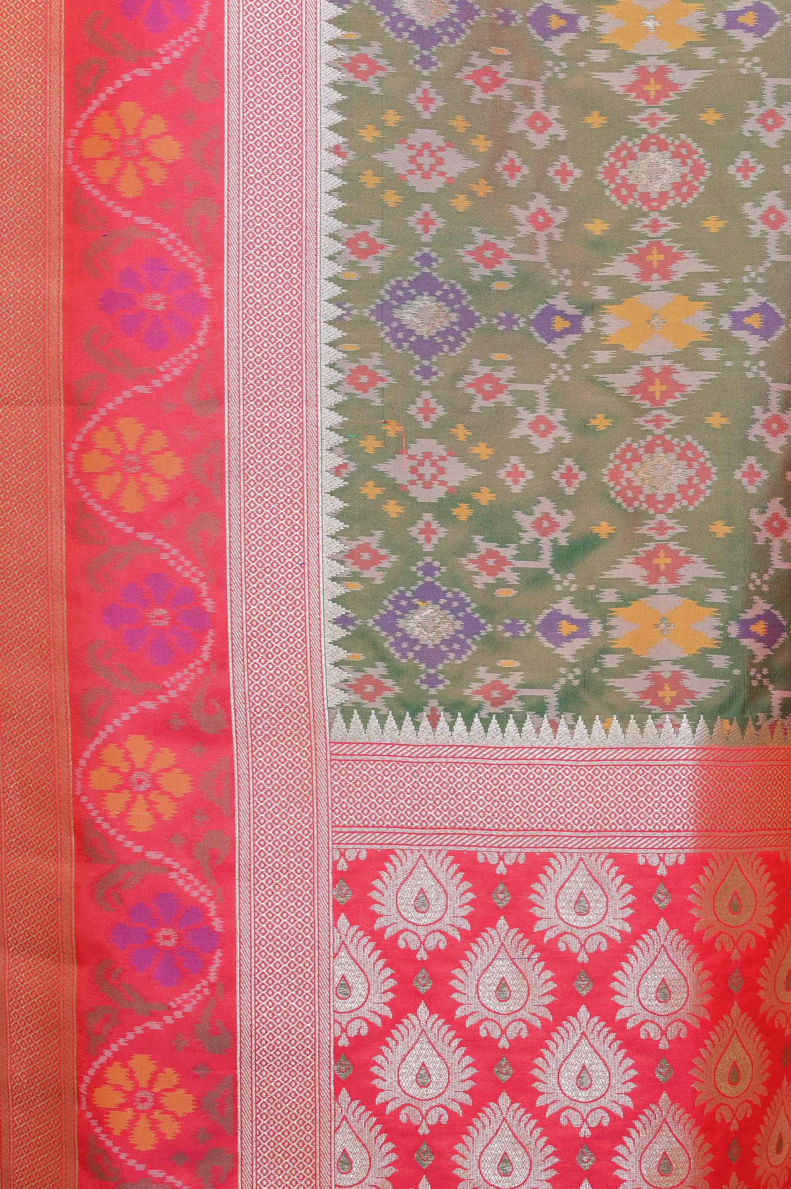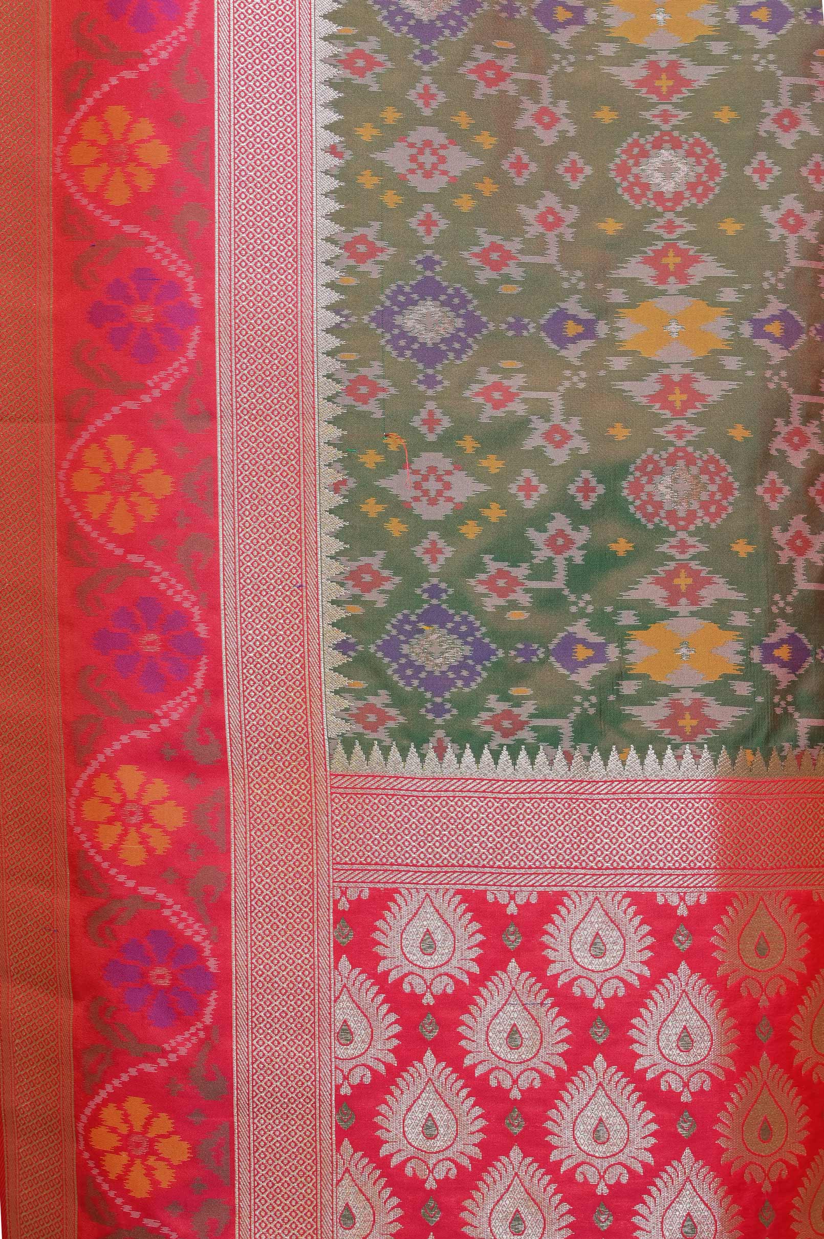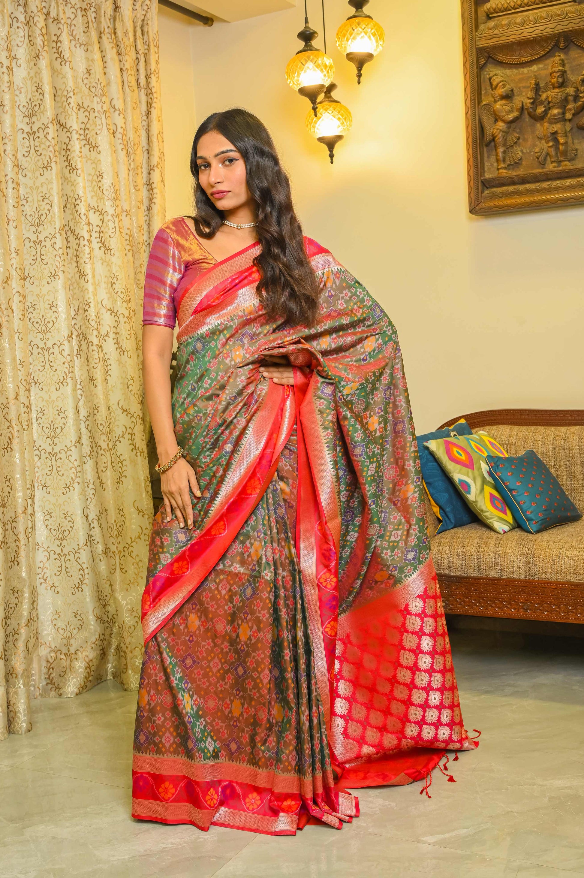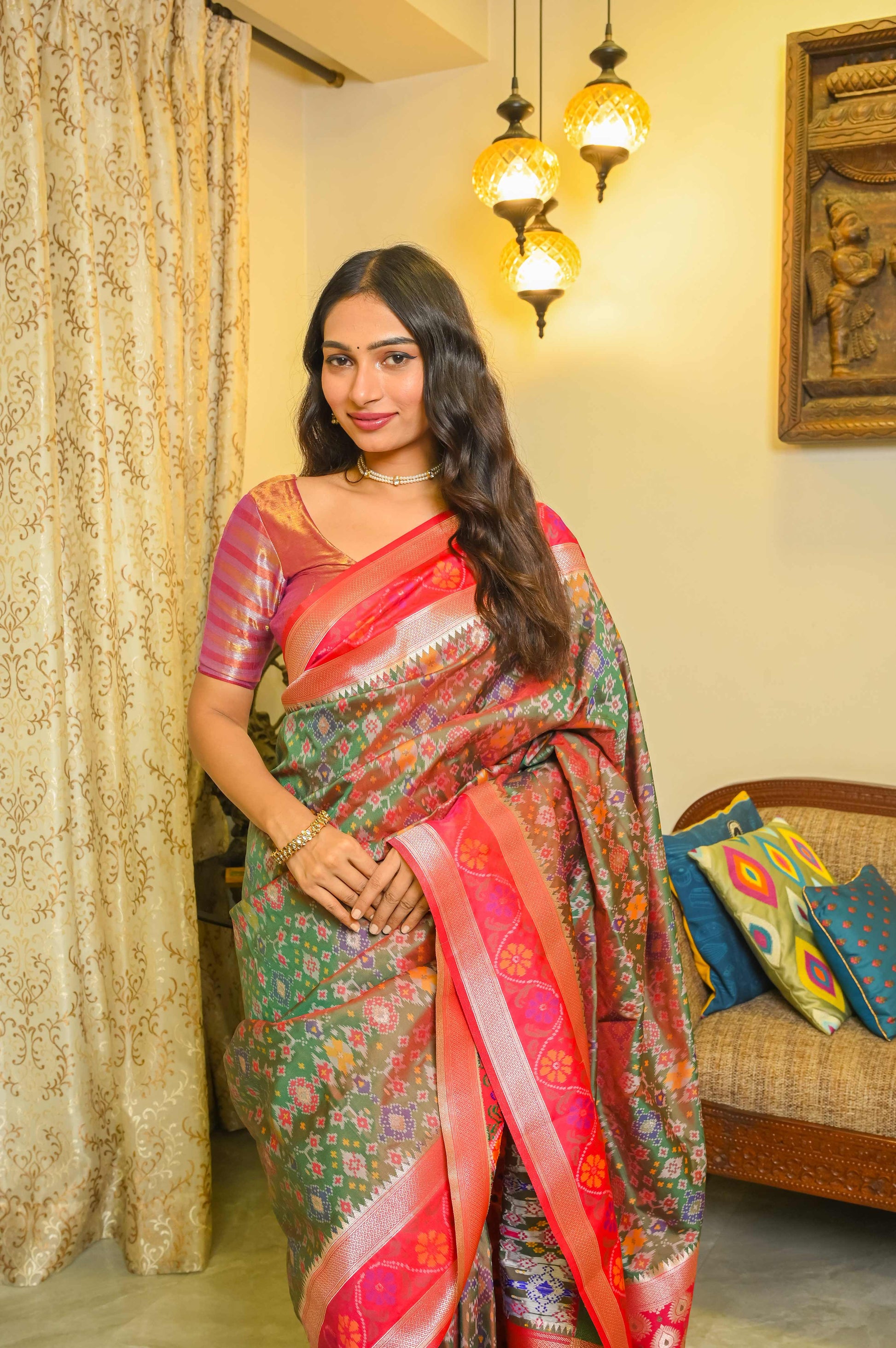 This elegant green and pinkish red Patola saree features delicate zari motifs on the palla and a stunning Patola border, showcasing exquisite craftsmanship. Paired with a plain contrast blouse accented by zari borders on the sleeves, it offers a perfect blend of tradition and sophistication for any special occasion.
