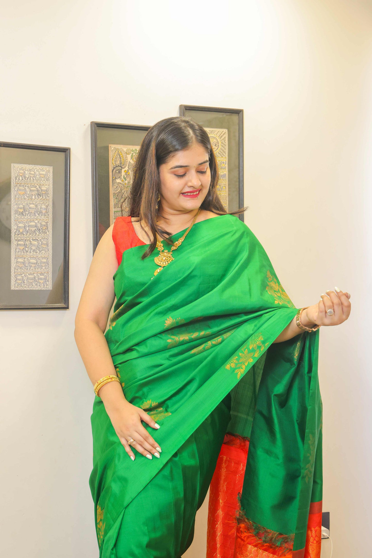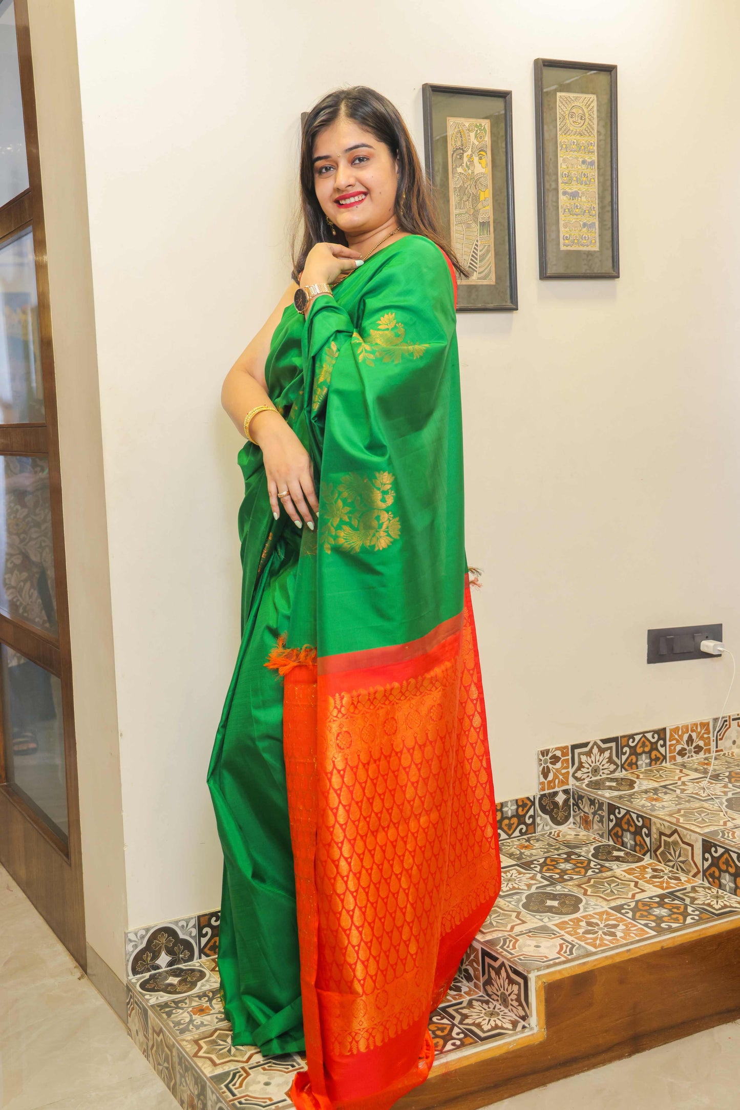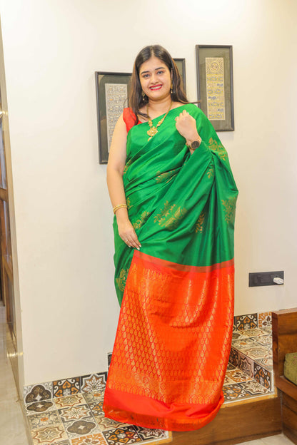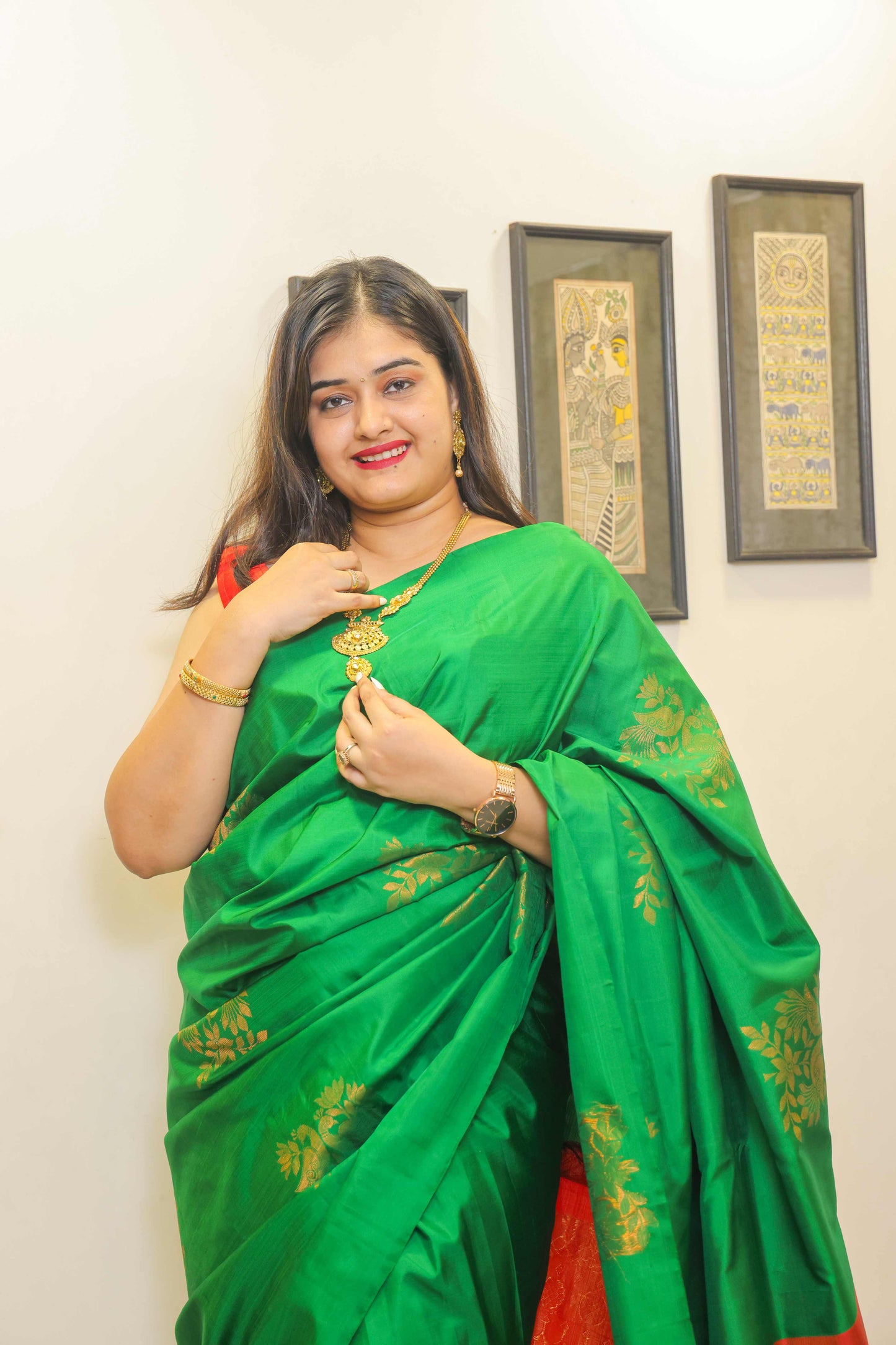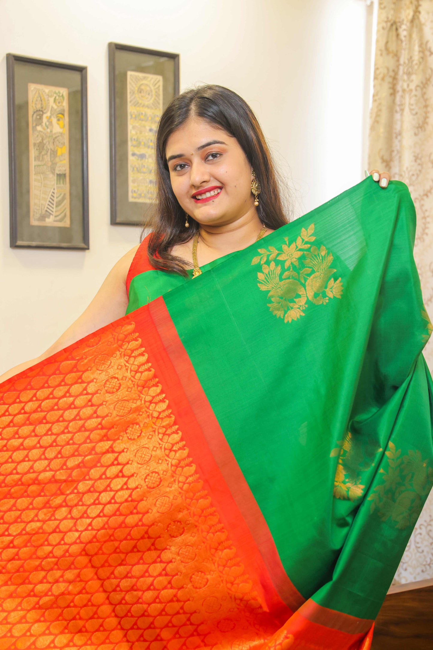 Pattu silk saree with green base featuring peacock zari motifs and a rich brocade palla.