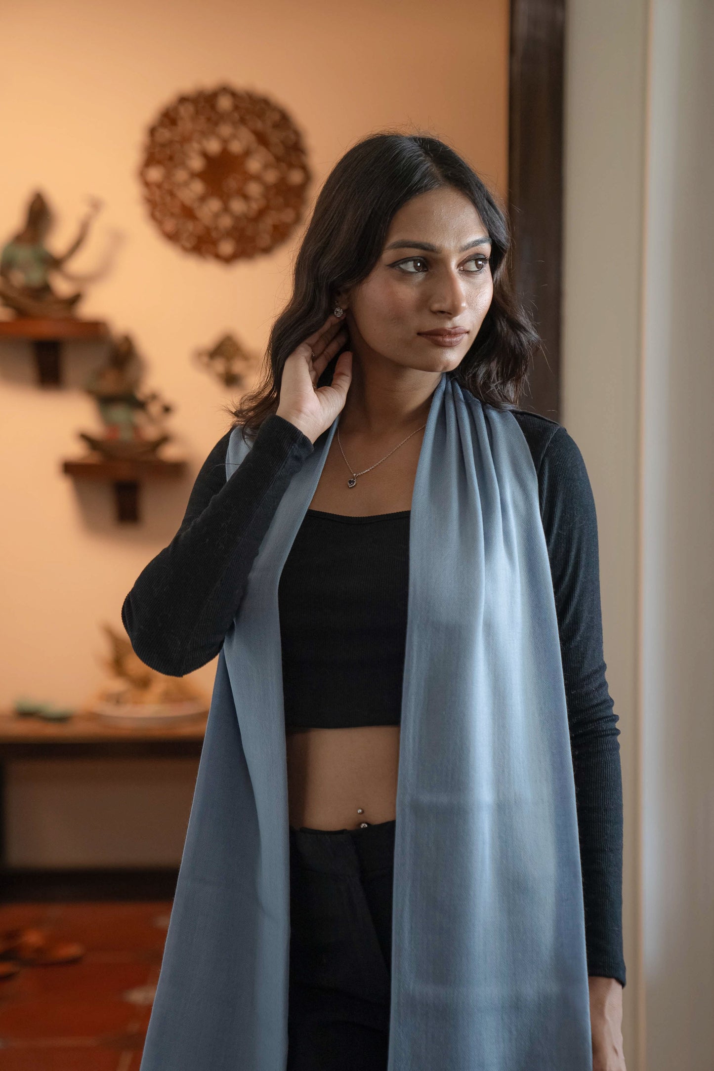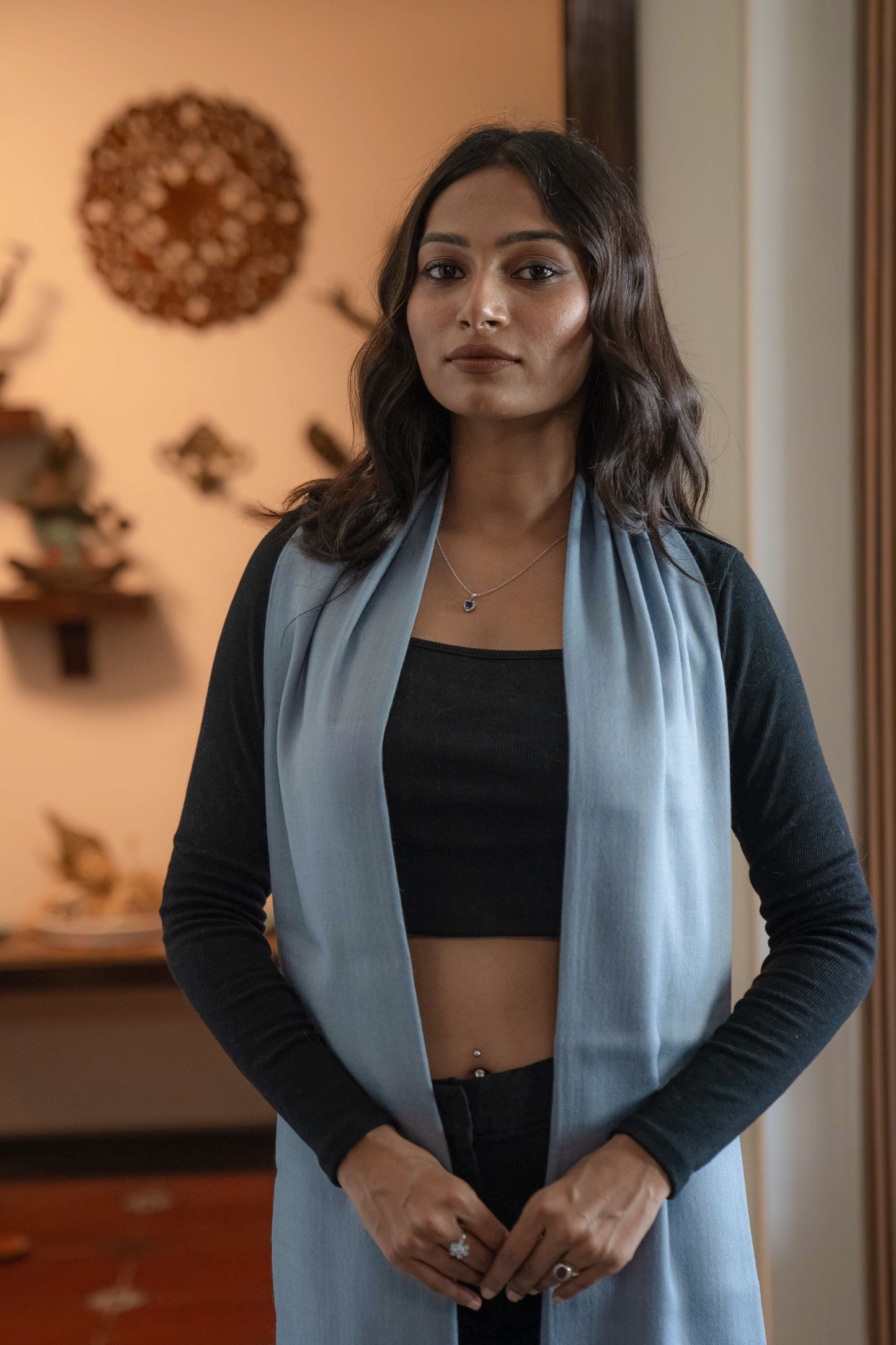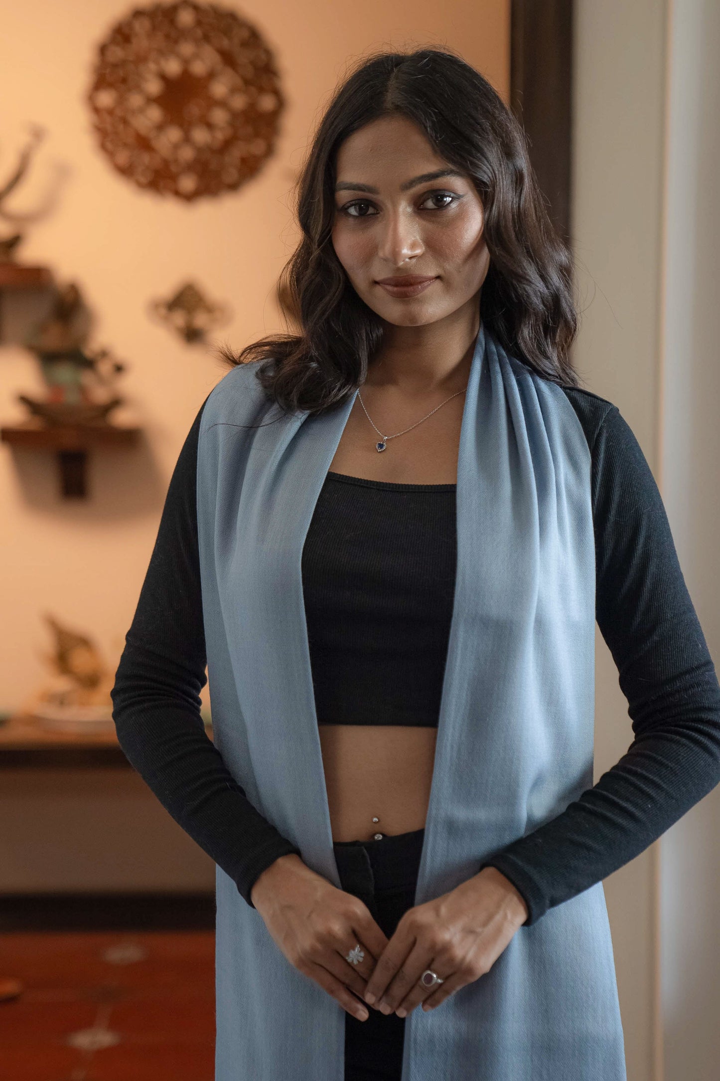 Crafted with 85% wool and 15% silk, this stole features a serene light blue color that exudes elegance and tranquility. A perfect accessory for any outfit, it brings a touch of sophistication and comfort.