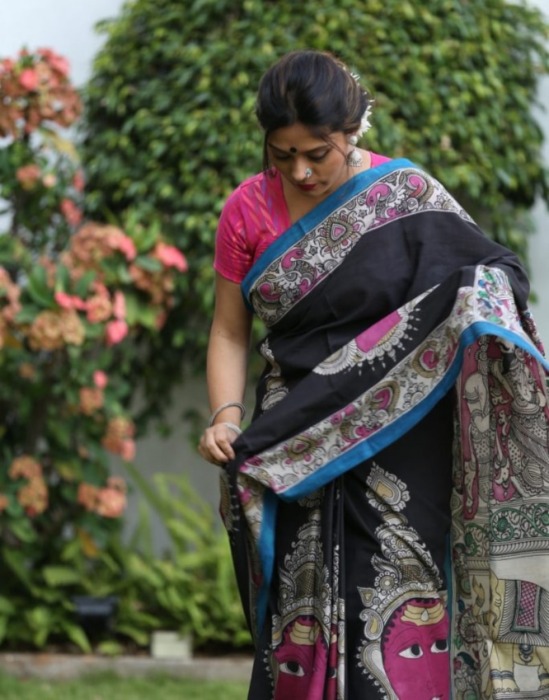 Kalamkari/Malmal Saree with hand painted faces at the base in Black and Magenta Colour