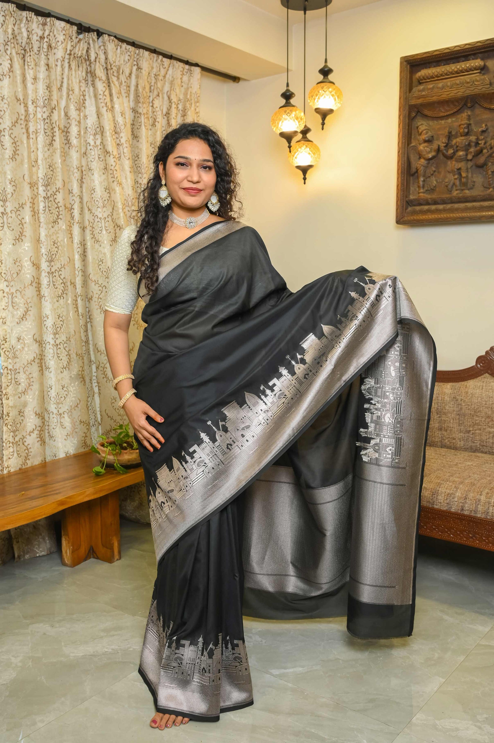 Experience timeless elegance with the Kashi Ghat Black Katan Silk Banarasi Saree. Featuring delicate silver zari woven ghats along the border and a striking zig zag palla, this saree beautifully captures the spiritual essence of Varanasi's iconic ghats. Paired with a heavy silver zari blouse, it promises to elevate your traditional wardrobe with grace and cultural richness.