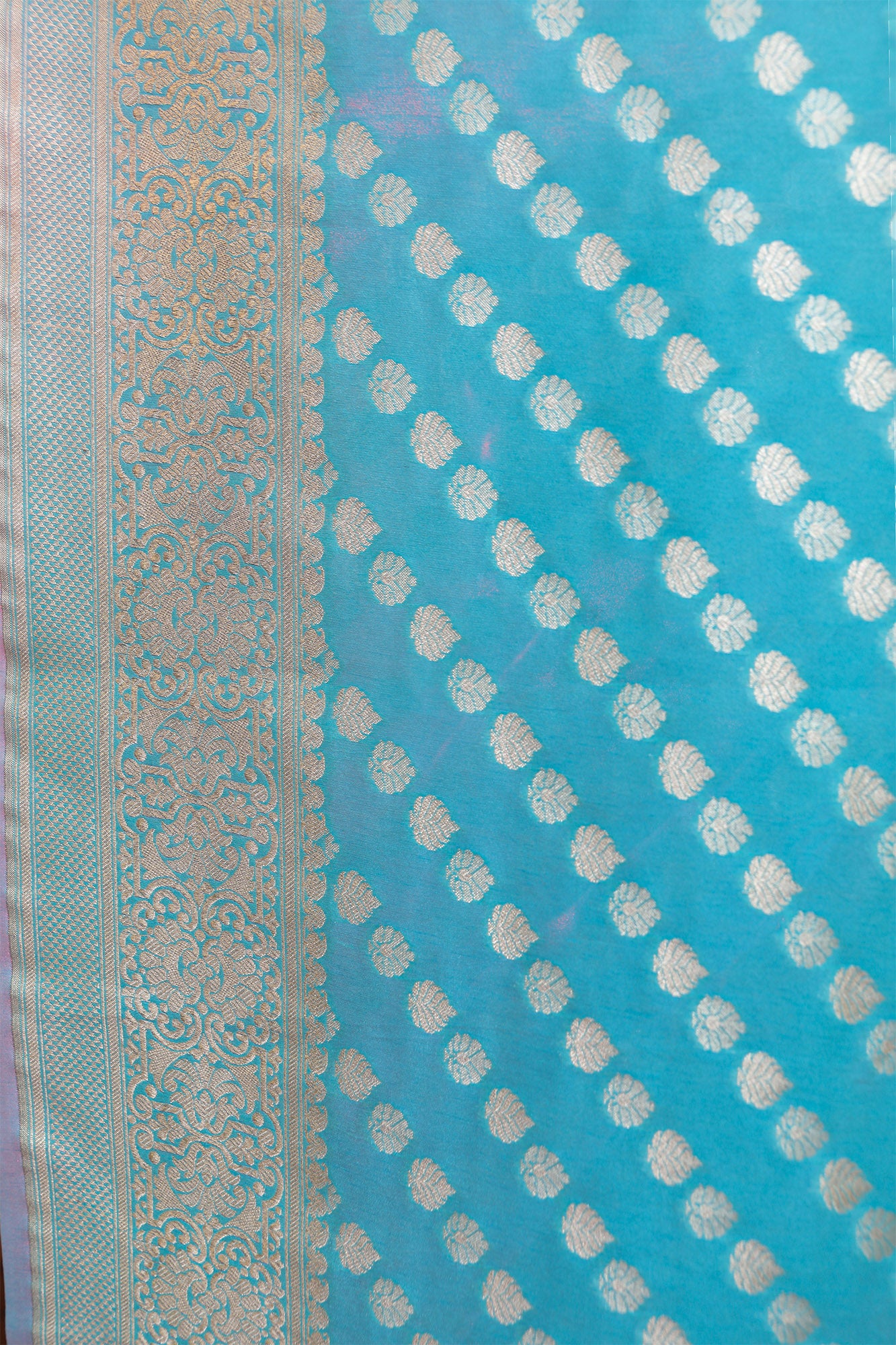 This elegant light blue katan silk saree features zari motifs all over, a heavy palla, and a heavy border. A plain blouse with border on the sleeves is available.