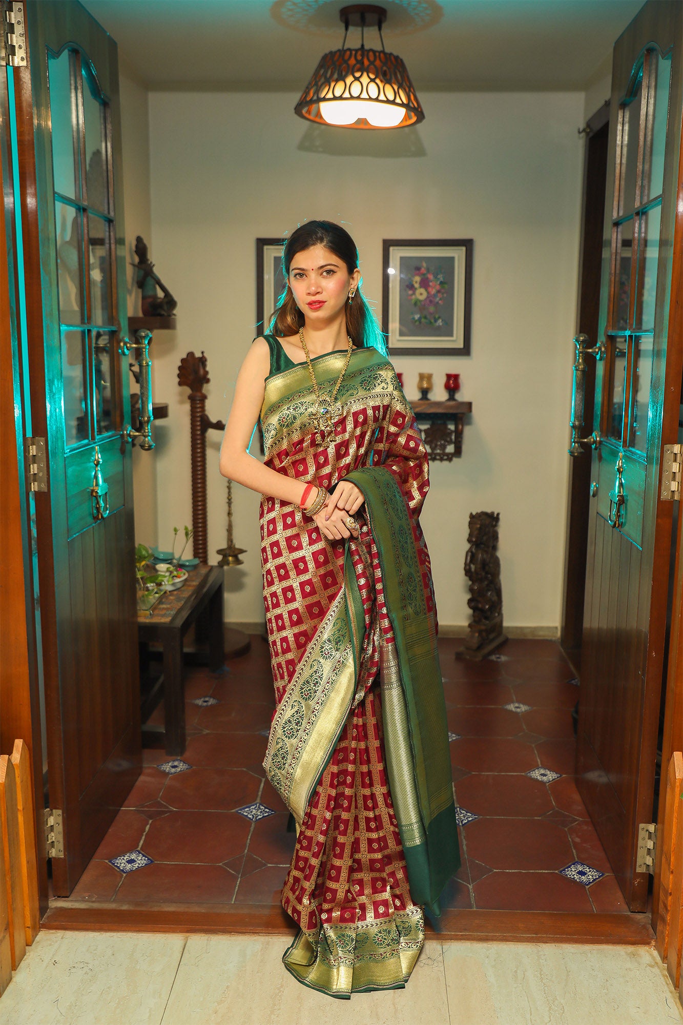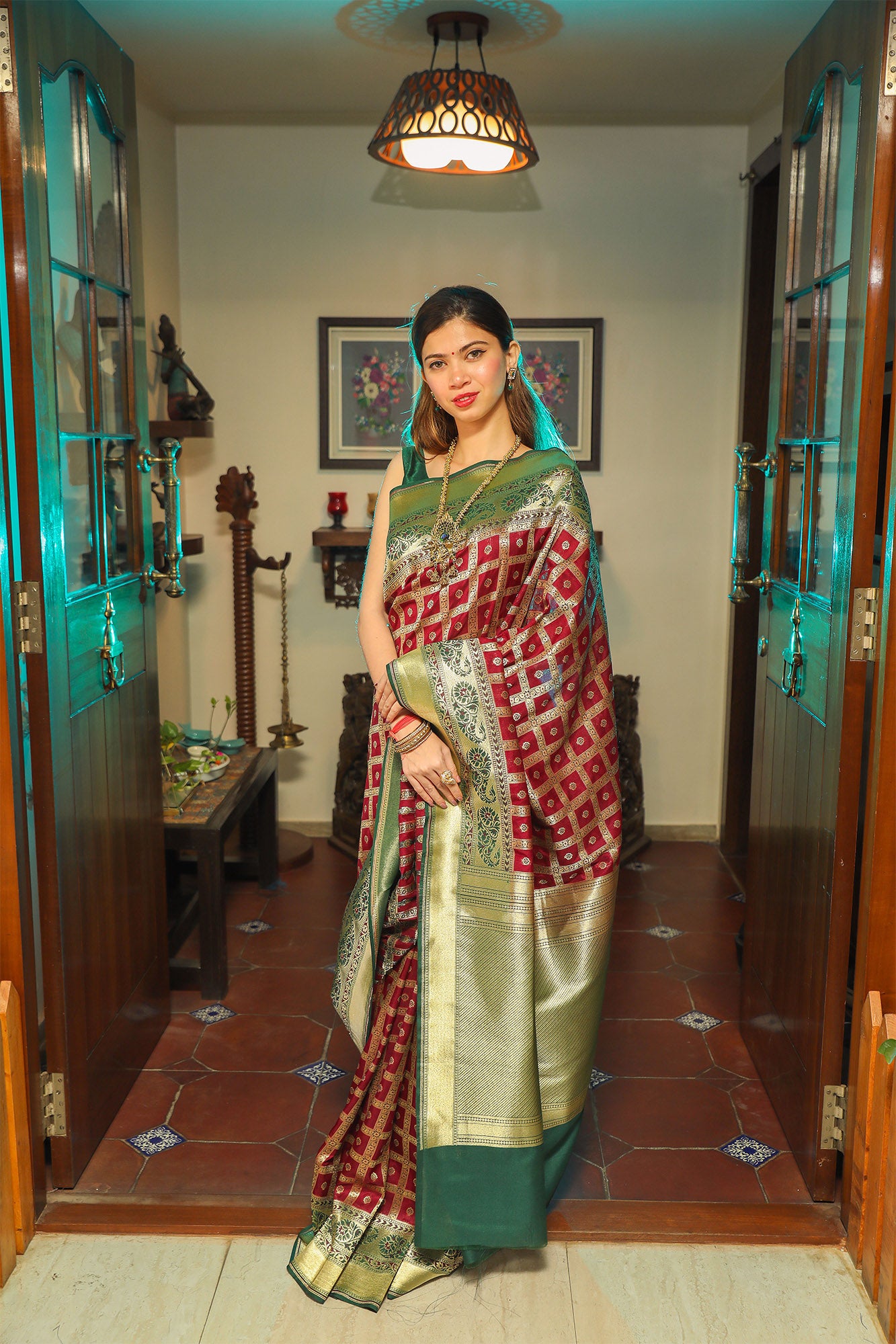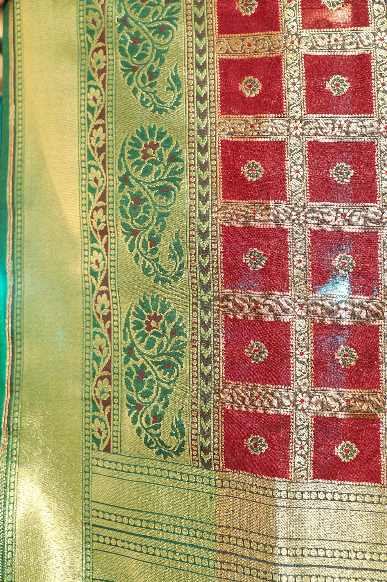 Maroon and Green Katan Gharchola Silk Saree