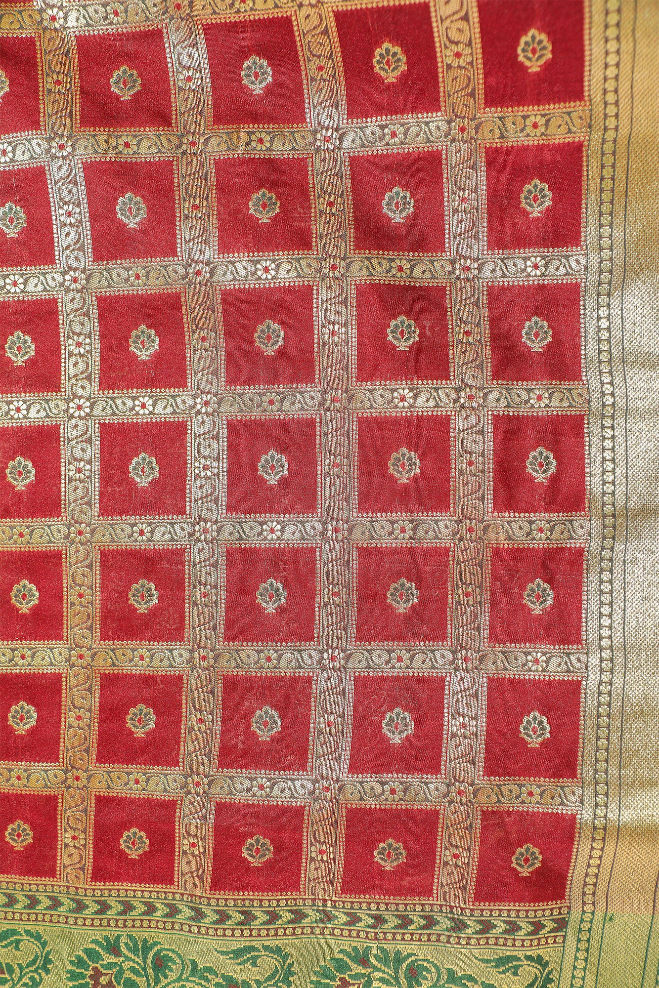 Featuring a maroon and green combination, this katan handloom gharchola silk saree has all-over zari work and a heavy woven border. Highlighted with meena work and a heavy palla, it comes with a green blouse with a zari border.