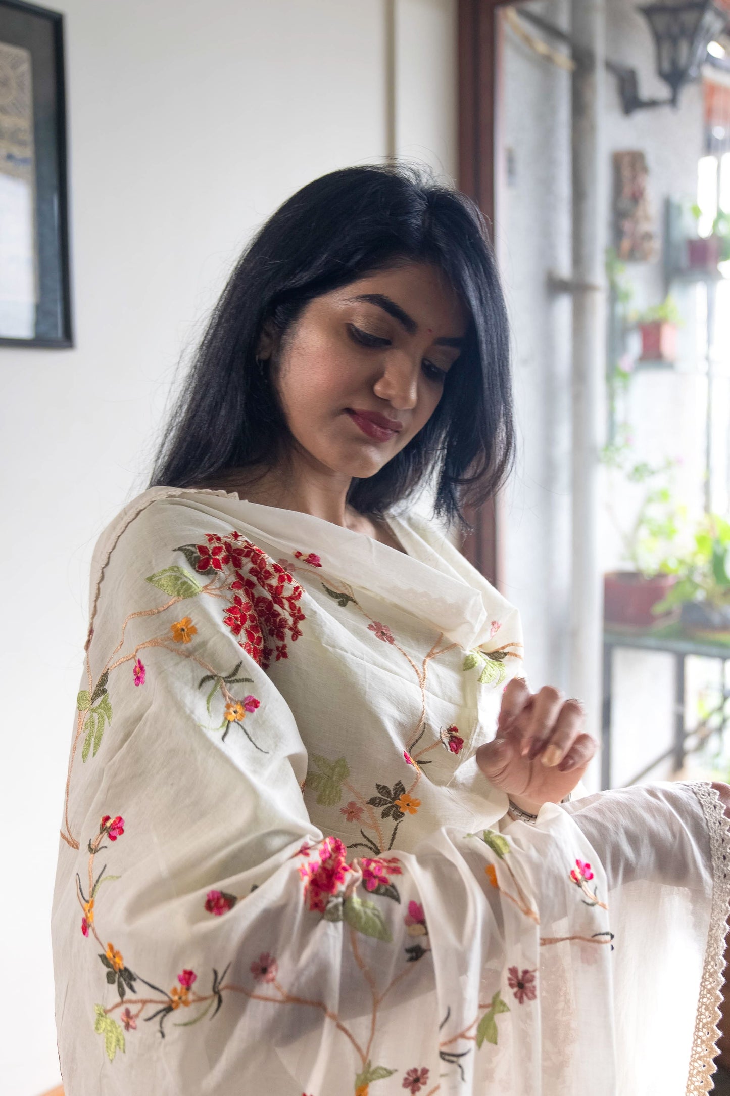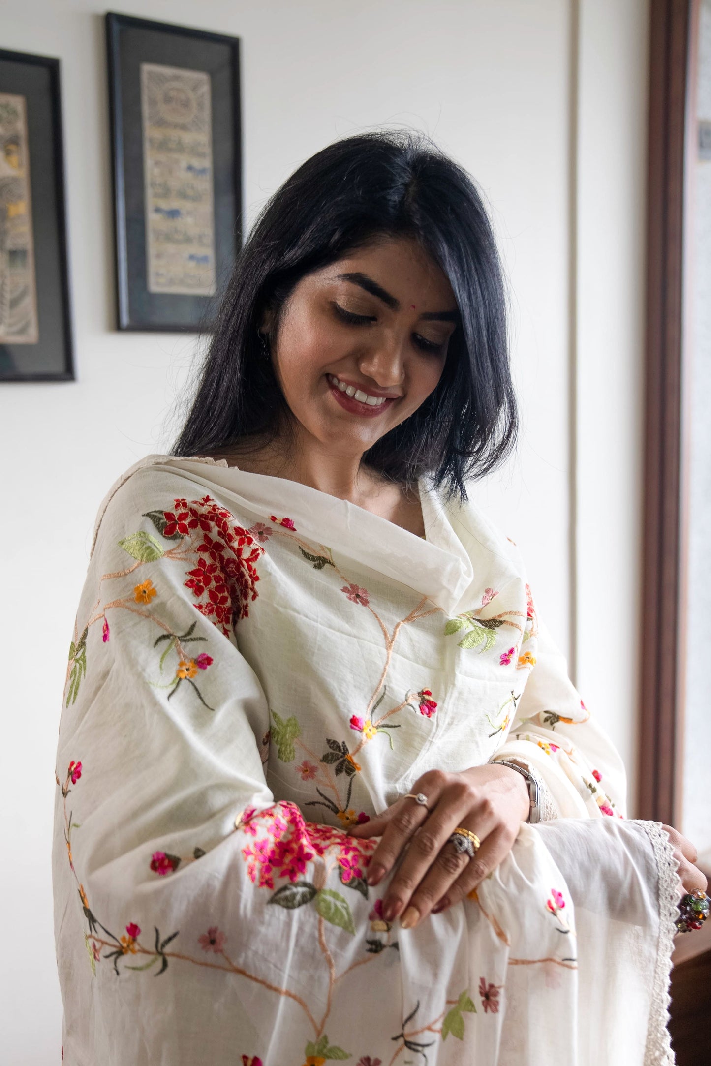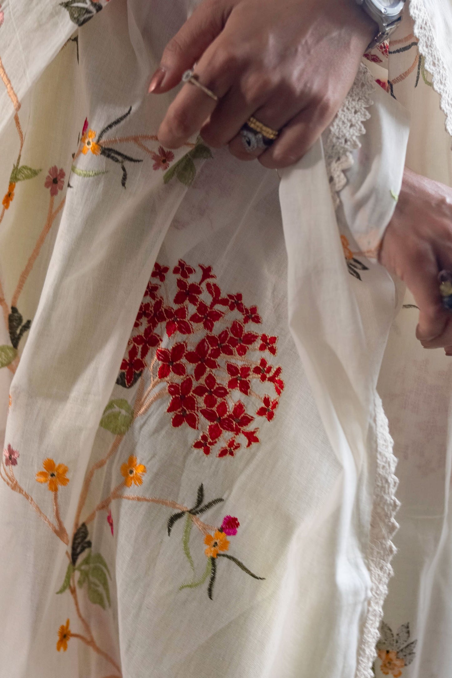 Mul White Dupatta with Red Floral Design