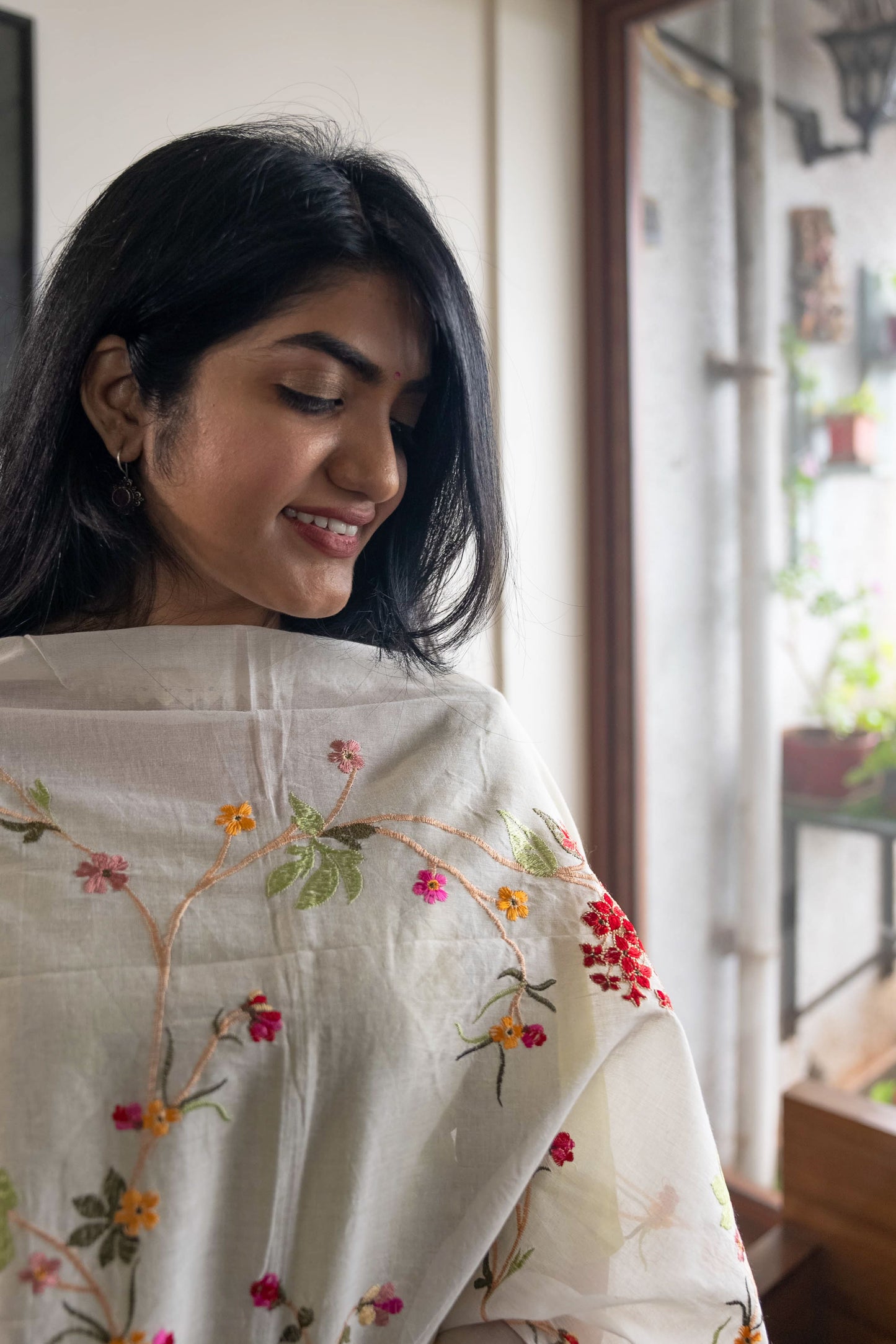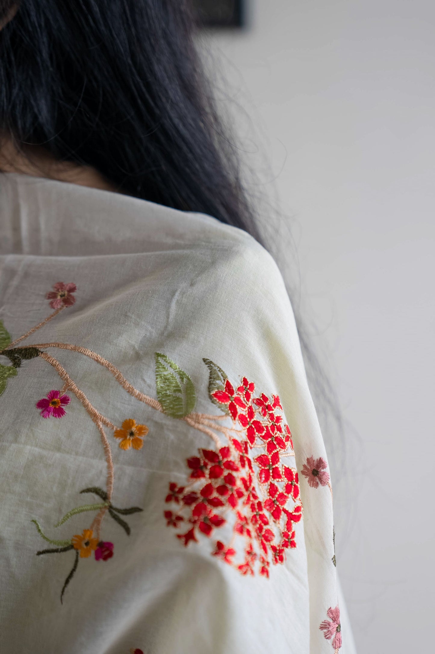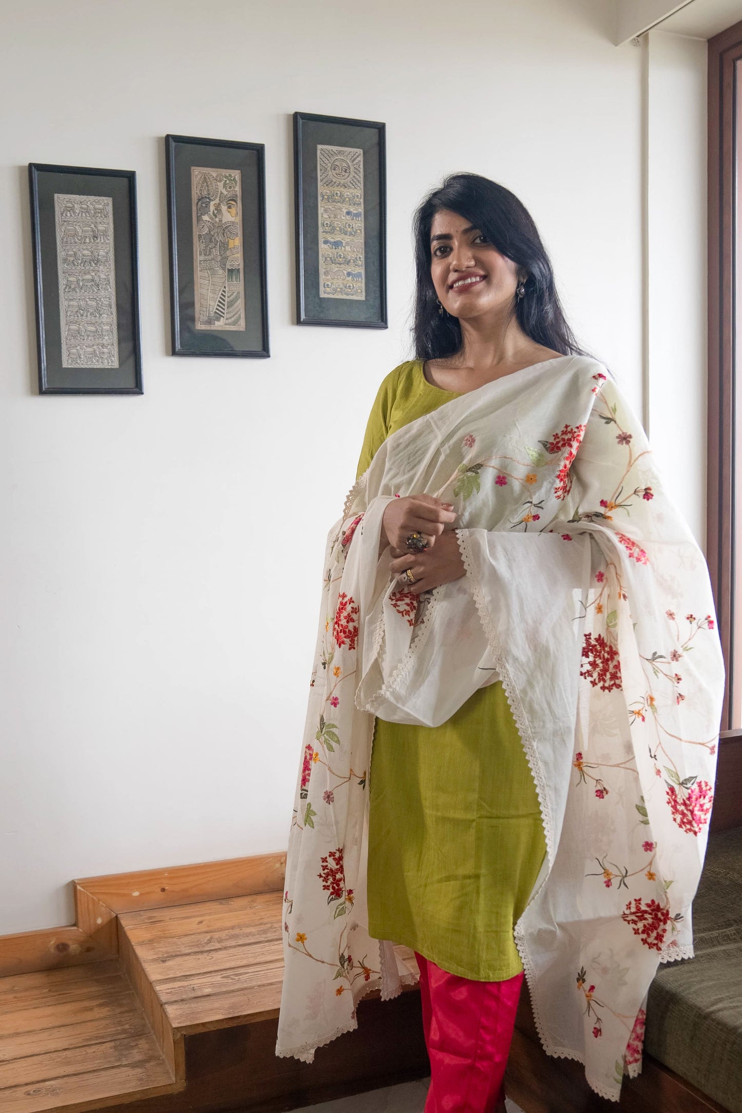 Mul White Dupatta with Red Floral Design