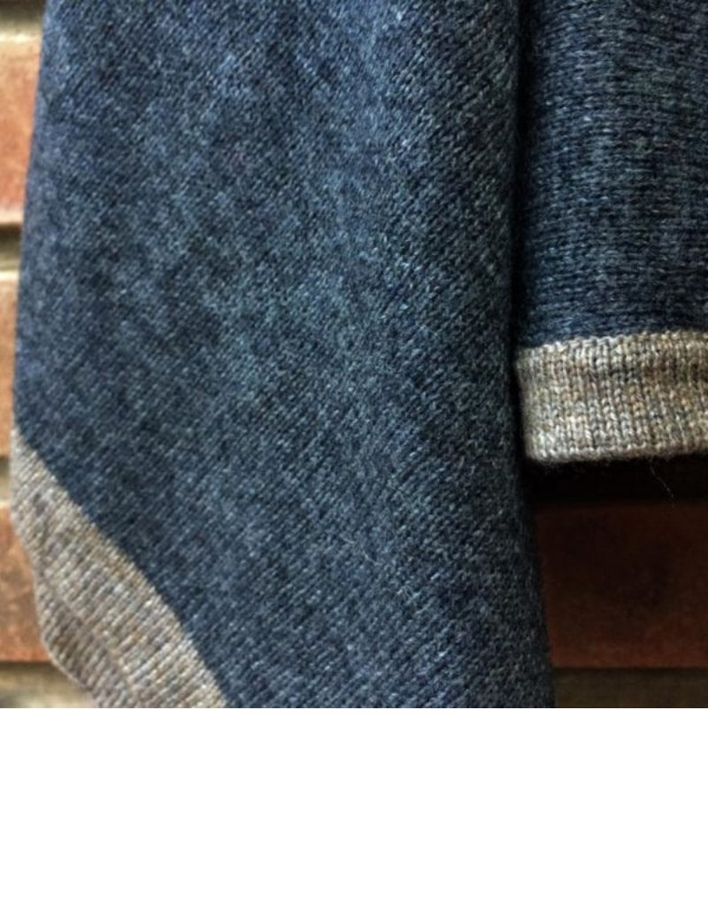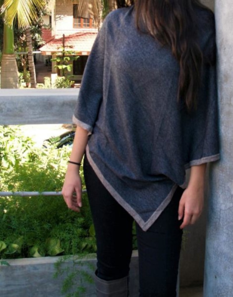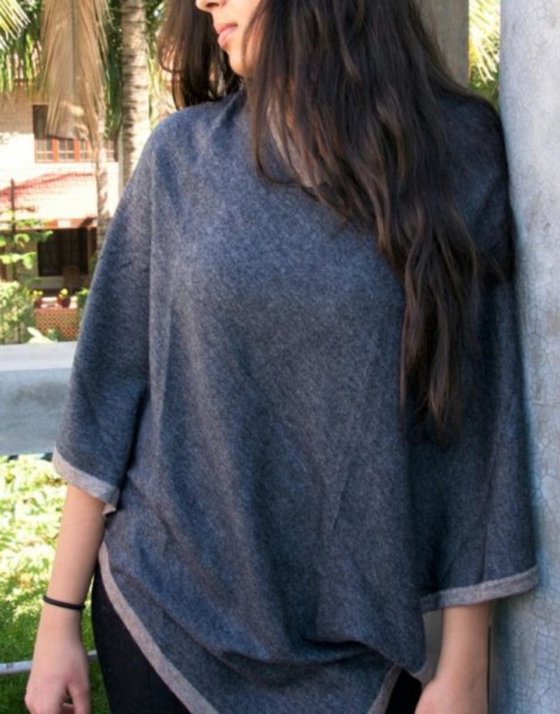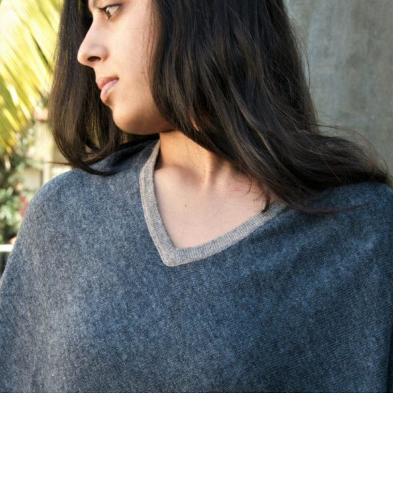A dark grey poncho with a brown border on a V neck. The fabric is pure cashmere wool.