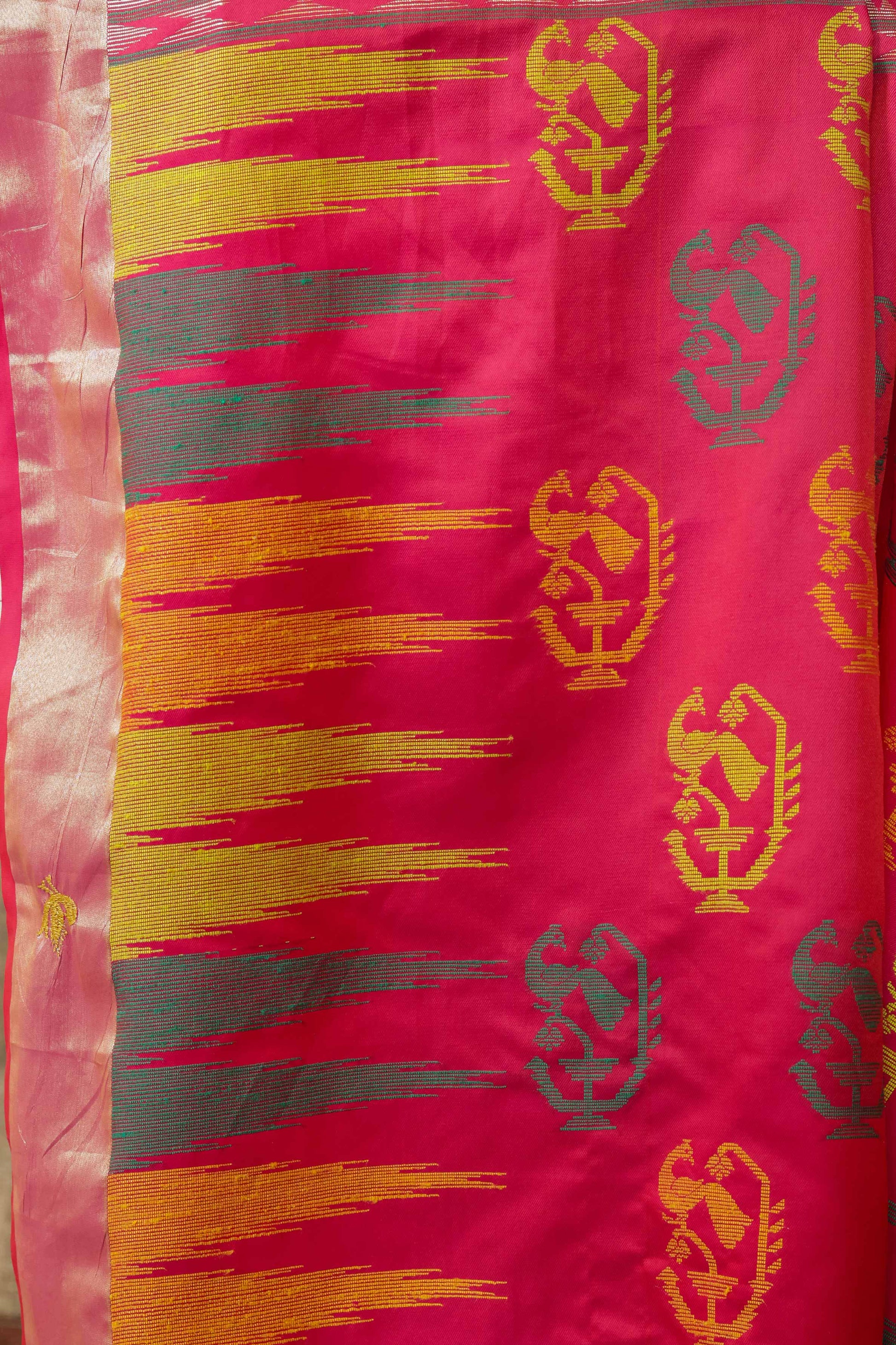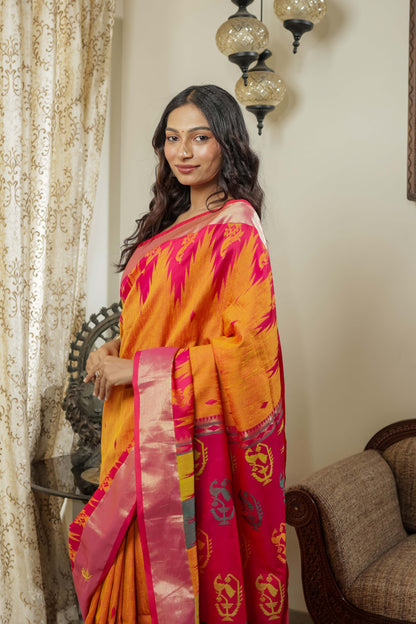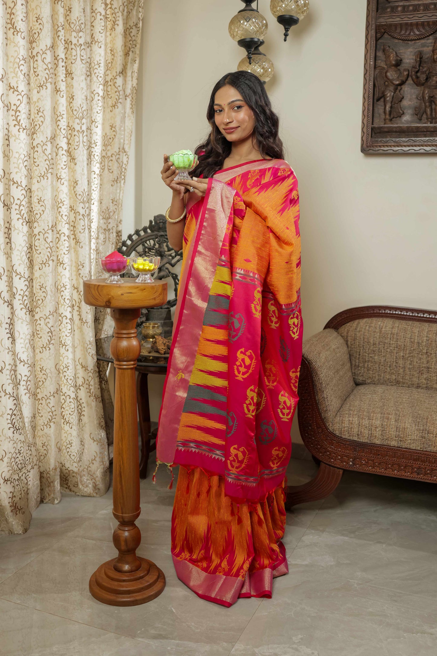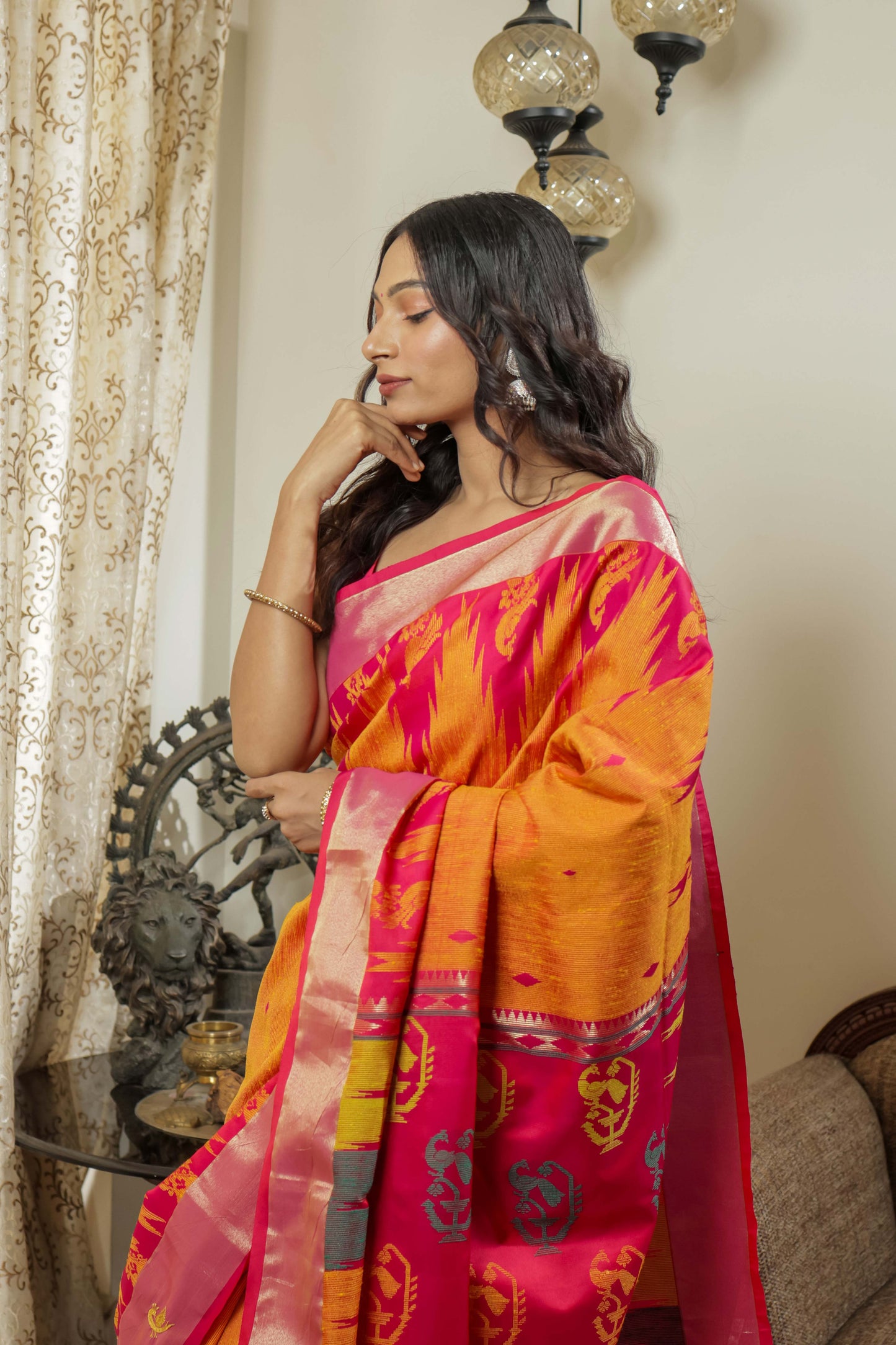 A striking saree in orange and pink jute silk with peacock motifs throughout. The expressive palla and soft texture make this saree a perfect choice for grand occasions.