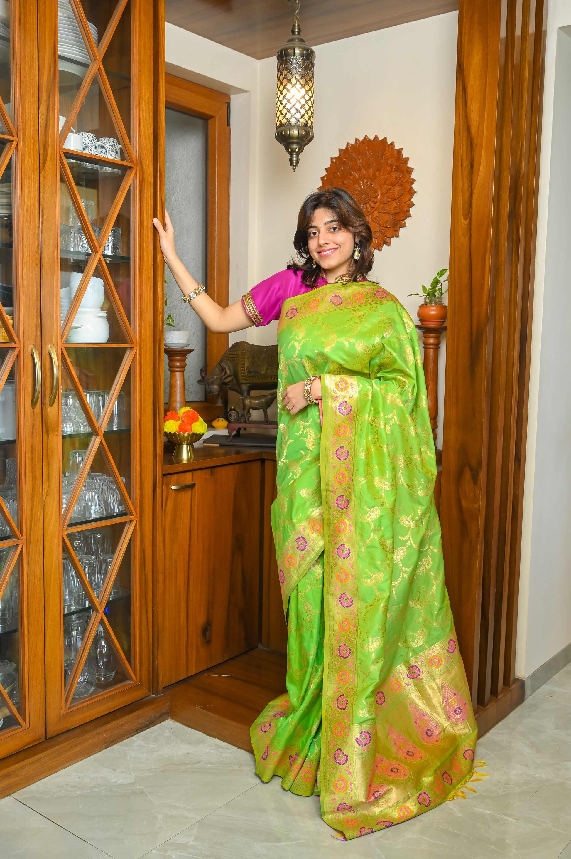 Experience elegance with this Parrot Green Meenakari Silk Banarasi Saree, featuring intricate zari jaal and a delicate meenakari border. The royal meenakari zari palla adds a touch of luxury, complemented by a plain green blouse with meenakari accents on the sleeves. Perfect for making a graceful statement at any special occasion.