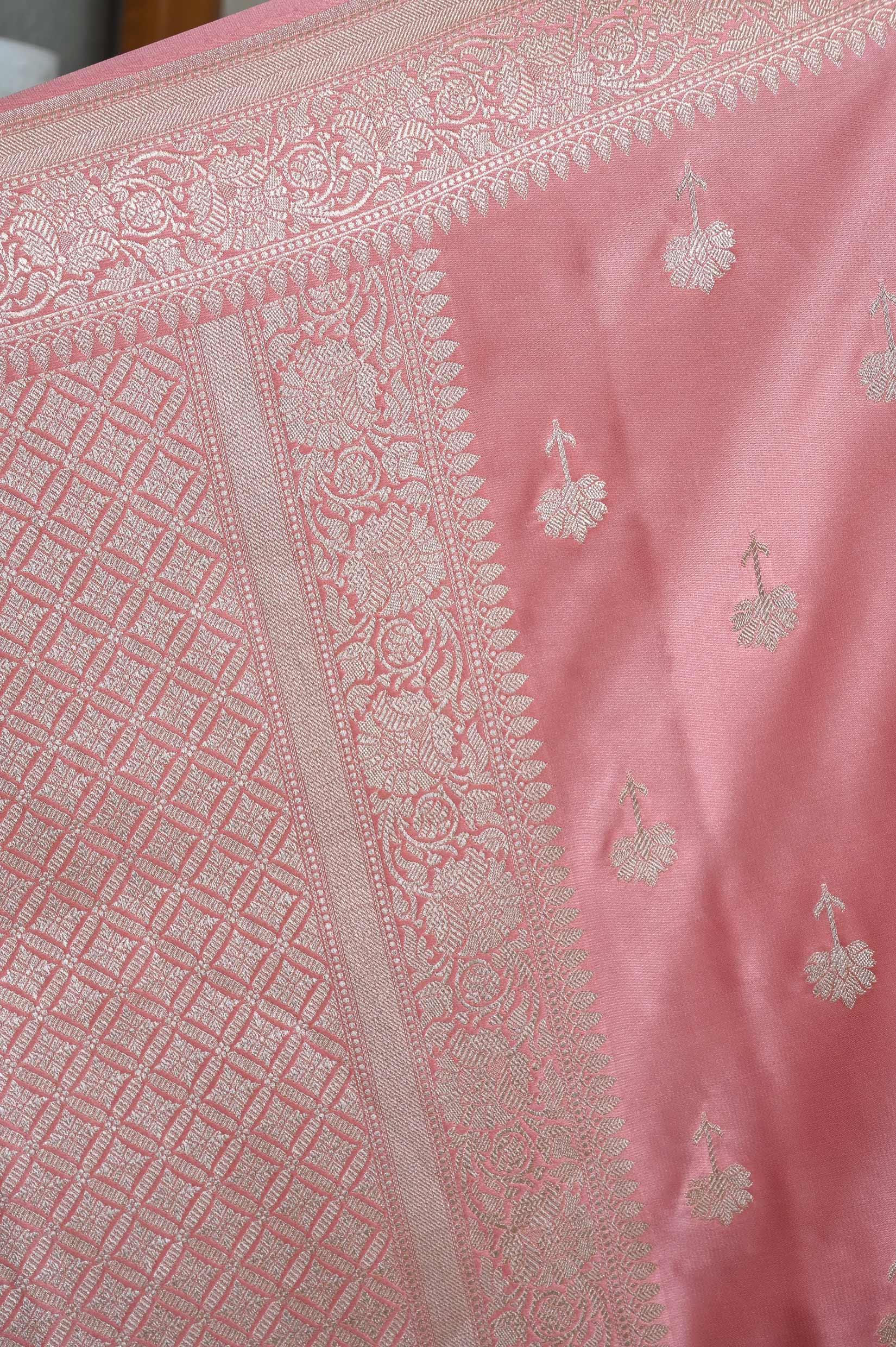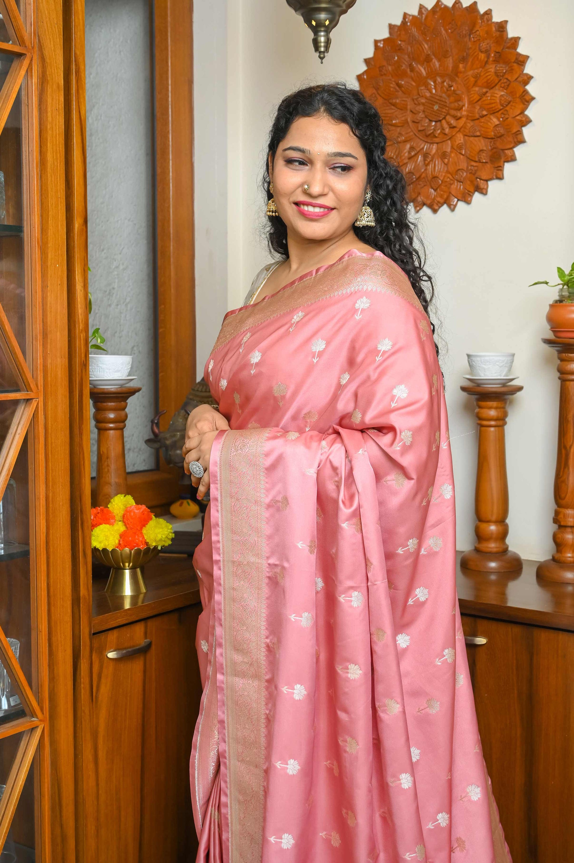 This pastel pink Katan silk Banarasi Saree features intricate zari flower motifs throughout, complemented by a stunning zari palla and delicate woven zari border. Paired with a plain blouse edged with zari, it elegantly blends traditional craftsmanship with subtle sophistication, perfect for graceful occasions.